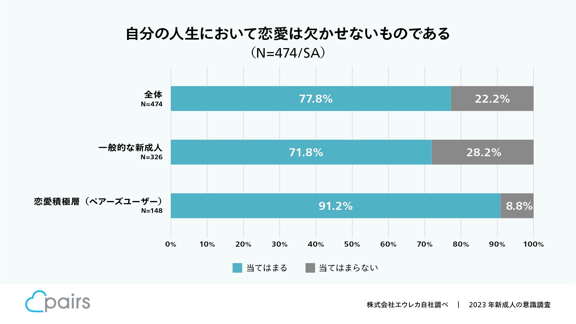 サービス開始10周年を迎えた日本で最も使われている※1恋活・婚活マッチングアプリ「Pairs」(ペアーズ)を運営する株式会社エウレカ(本社:東京都港区、代表取締役CEO 石橋準也)は、2023年に成人を迎える474名(2022年4月~2023年3月に18歳、19歳、20歳になる方)を対象に「2023年新成人の意識調査」を実施し、調査結果を「恋愛」「出会い」「ライフスタイル」の3つのカテゴリーごとに発表します。