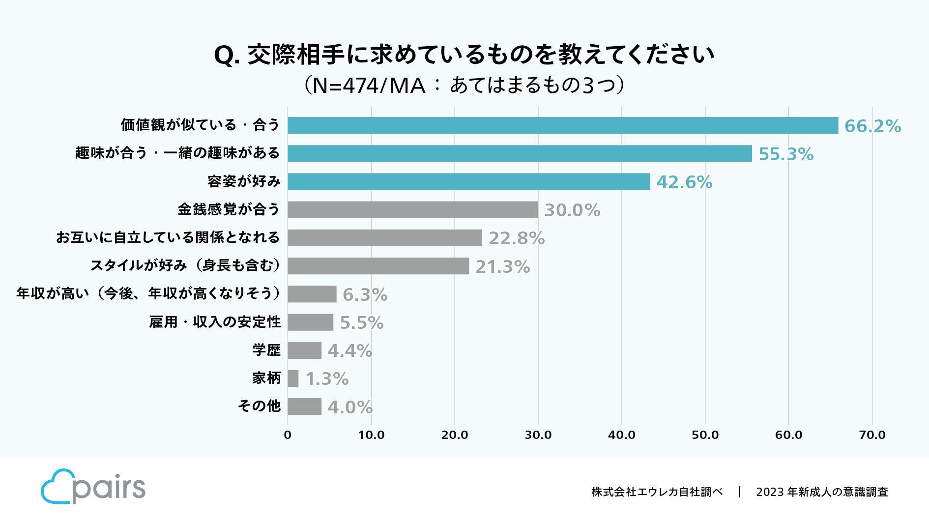 新成人が交際相手に求めることは、「価値観が似ている・合う」(66.2%)、「趣味が合う・一緒の趣味がある」(55.3%)などが上位にあがりました。新成人は共通の価値観や趣味を交際相手に求める傾向にあることがわかりました。