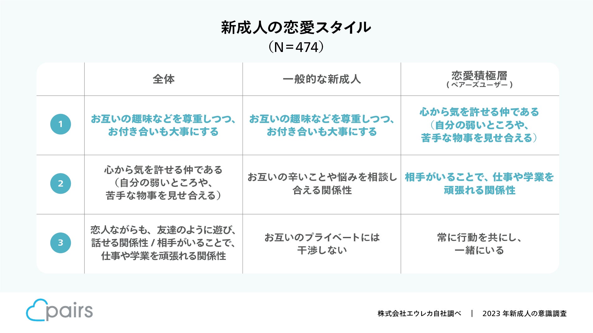 新成人の恋愛スタイルは「気遣い尊重型」。恋愛積極層(ペアーズユーザー)は気を許しながら互いを高め合う傾向に