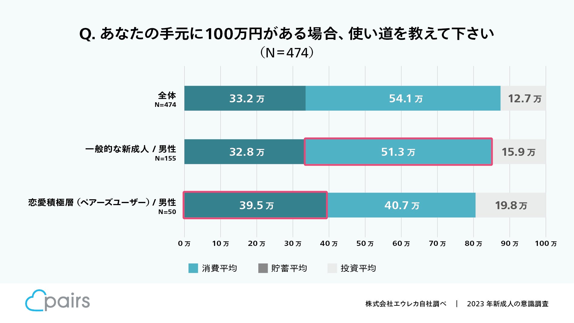 【お金の使い方】100万円あったら54.1万円を貯蓄。恋愛積極層(ペアーズユーザー)は一般的な新成人に比べ、約7万円支出・投資が多い。