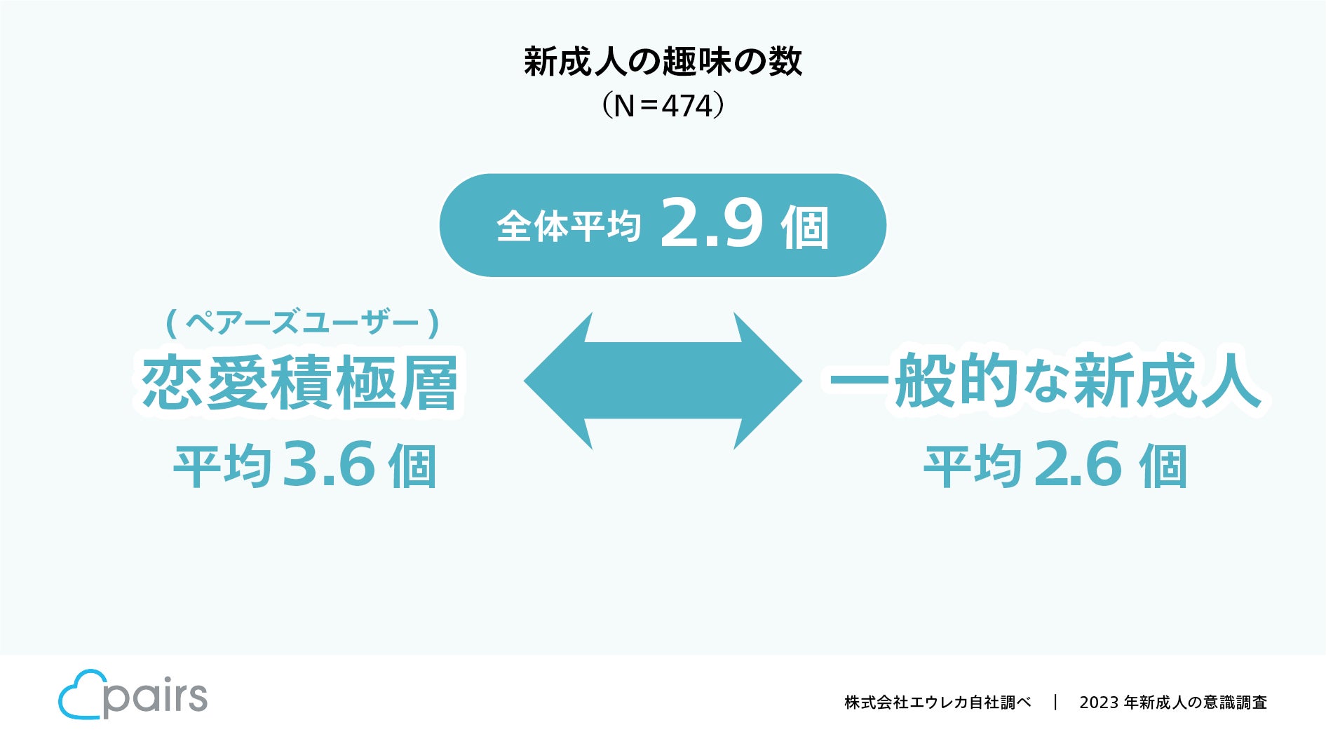 新成人の趣味の数を聞くと平均「2.9個」となりました。この結果を恋愛積極層(ペアーズユーザー)と一般的な新成人で比較すると、恋愛積極層(ペアーズユーザー)は平均「3.6個」となり、恋愛積極層(ペアーズユーザー)の方が趣味を多く持つことがわかりました。