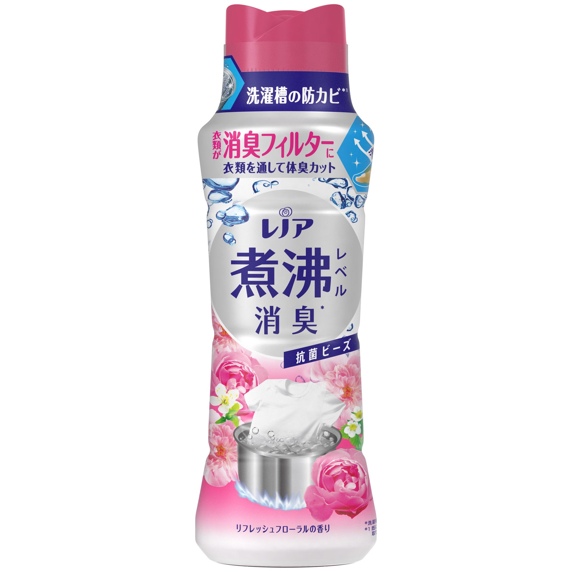 左から:「レノア煮沸レベル消臭抗菌ビーズ スポーツ クールリフレッシュ&シトラスの香り」「レノア煮沸レベル消臭抗菌ビーズ 部屋干し 花とおひさまの香り」「レノア煮沸レベル消臭抗菌ビーズ ウォータリーグリーンの香り」「レノア煮沸レベル消臭抗菌ビーズ リフレッシュフローラルの香り」