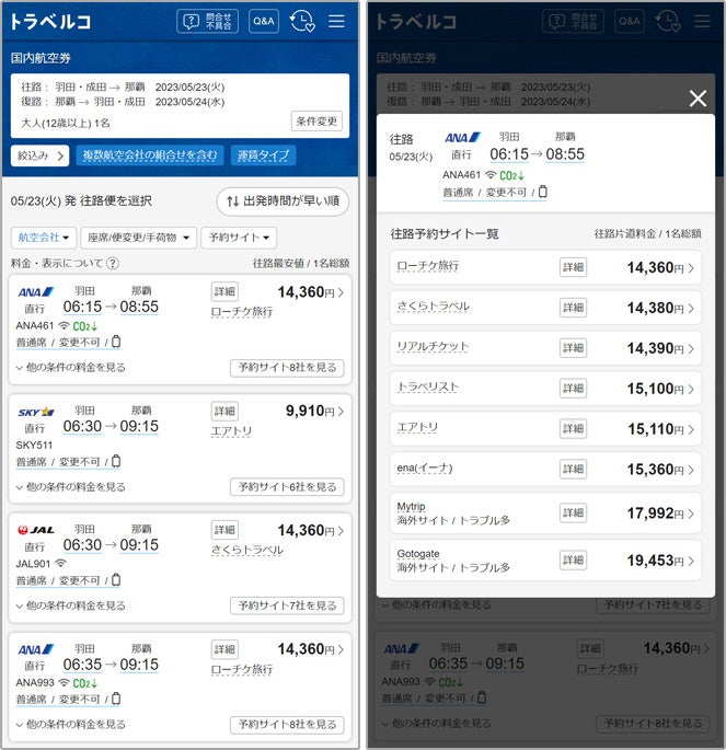 トラベルコ 国内航空券比較サービスは、複数の旅行会社・航空会社が取り扱う国内航空券を一括で検索・比較することのできるサービスです。2023年3月28日、新たにローチケ旅行との連携を開始し、同サイトの取り扱う国内航空券をトラベルコ内で検索・比較することができるようになりました。これにより、予約先サイト・価格の選択肢がさらに充実しました。
