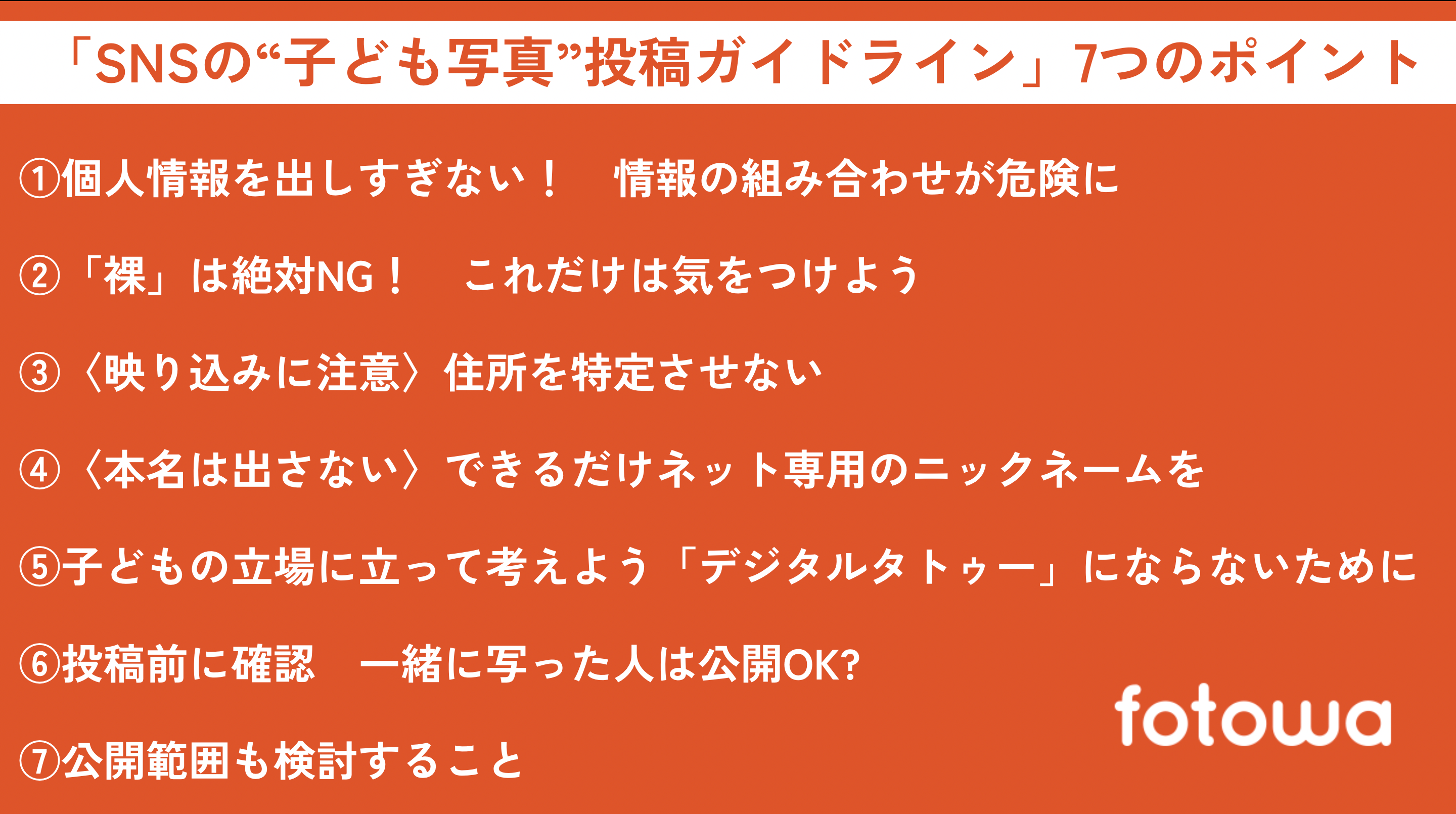 この結果を受け、fotowaは専門家監修のもと、「SNSの“子ども写真”投稿ガイドライン・7つのポイント」を公開したことをお知らせします。