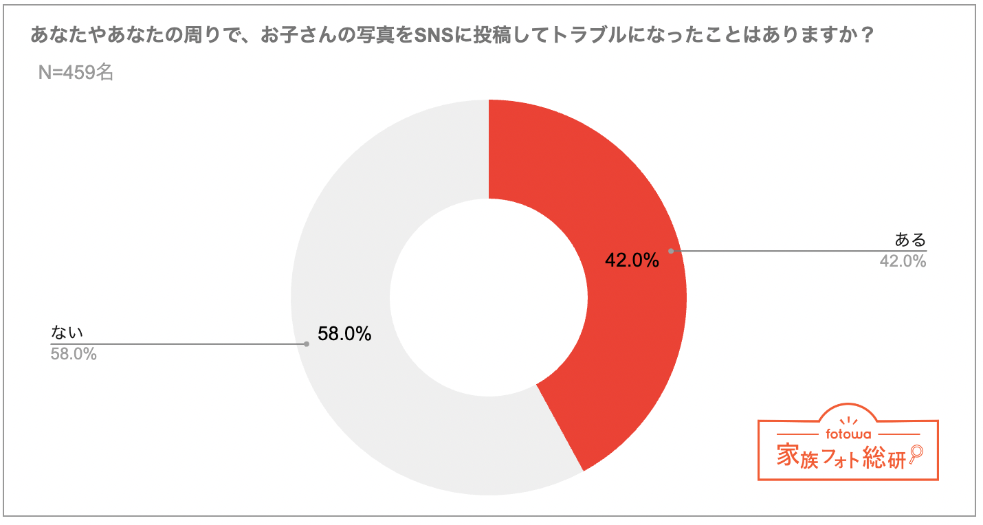 「あなたやあなたの周りで、お子さんの写真をSNSに投稿してトラブルになったことはありますか?」と伺うと、約4割の人が「ある」と回答しました。