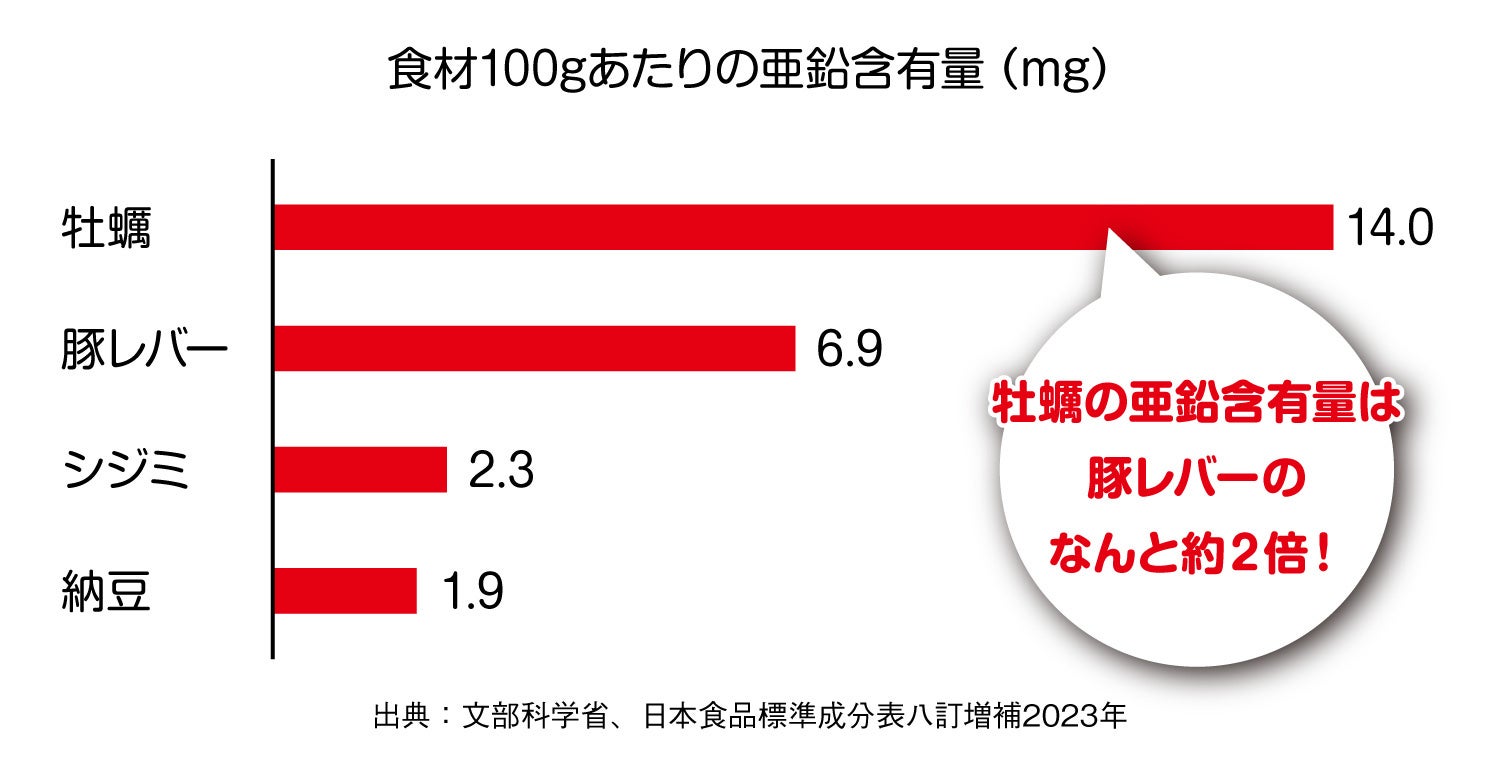 そんな亜鉛が、牡蠣には100gあたり14.0mg含まれています。その量は、なんと豚レバーの約2倍、シジミの約6倍、納豆の約7倍にもなります。不足すると免疫力低下にもつながる亜鉛を手軽に摂取でき、さらに、血液の形成を助けるビタミンB12やアミノ酸の一種であり疲労回復の効果もあるタウリンも豊富。まさに「海のスーパーフード」なのです。