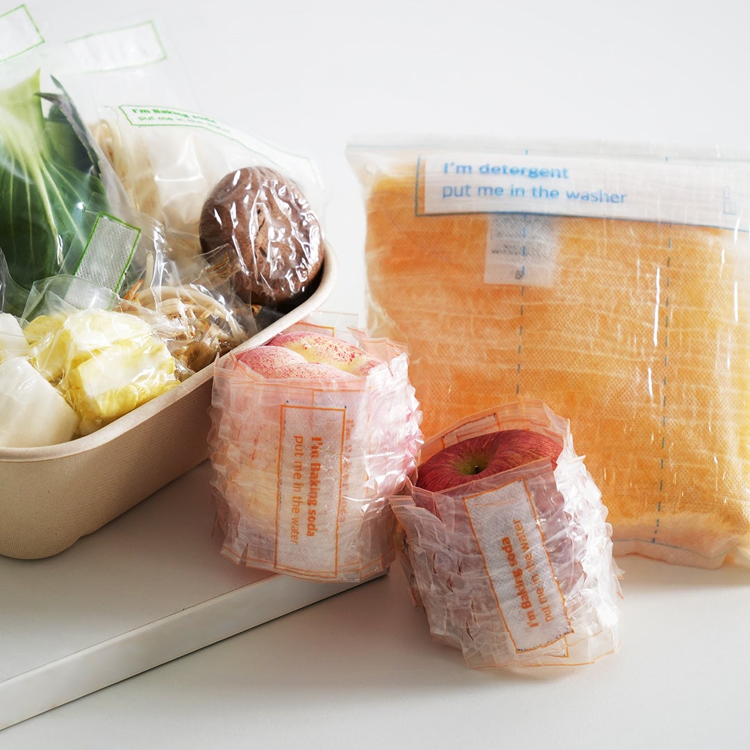 水溶性プラスチックに紙状の洗剤や重曹のフィルムを組み合わせた、環境に優しい梱包用パッケージ。商品と一緒に洗うことでプラスチックは溶け、ゴミを削減し、商品に付着した化学物質も除去。メンタリング期間中、Zero Bagの使用に適した商品を幅広く検討し、当初考えていた衣類だけでなく、野菜やフルーツ、ミールキット等にもZero Bagの活用範囲を拡大。