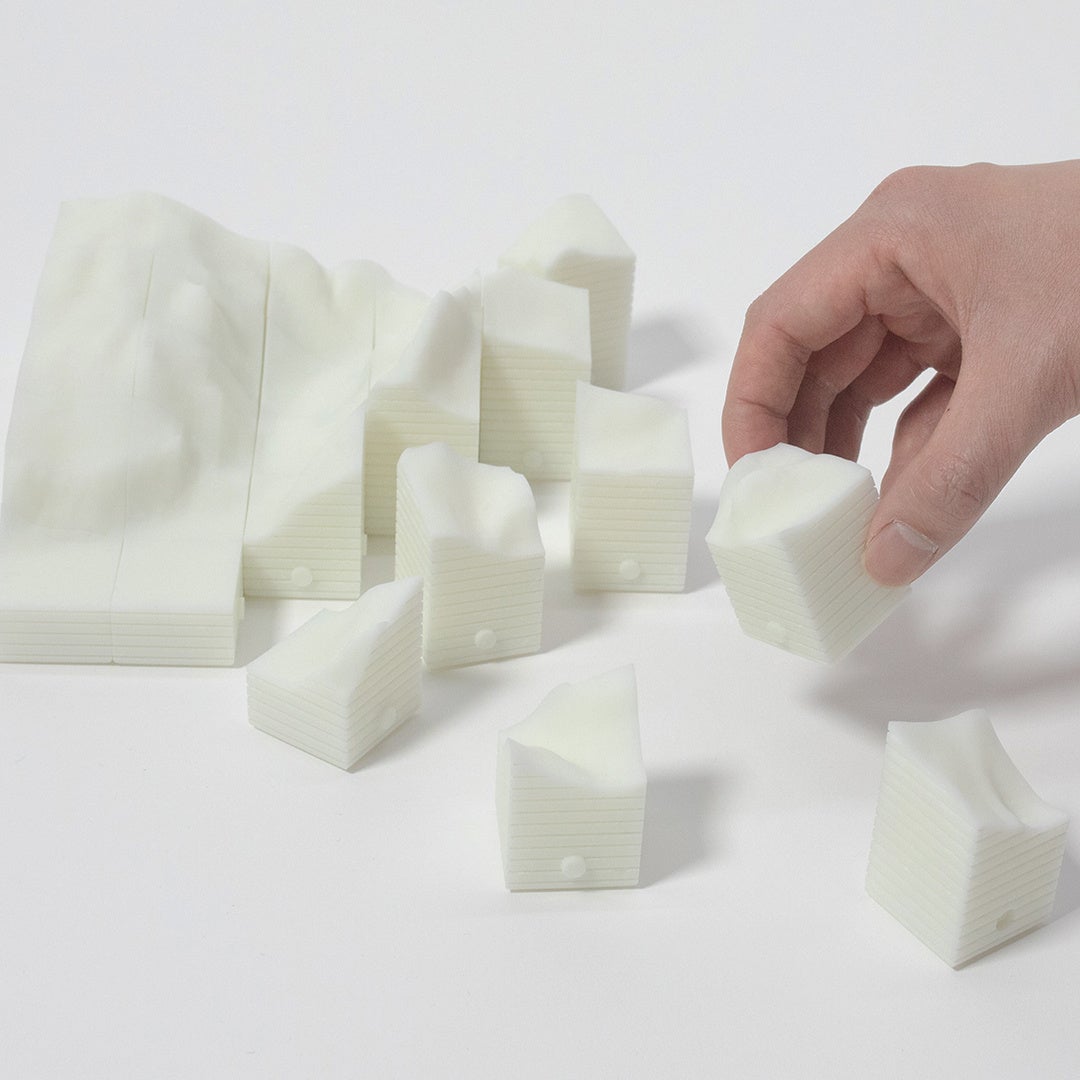 視覚障がいを持つ人が、触覚を通じて楽しみながら地形などを学べる3Dパズル。視力回復トレーニングの専門家や視覚障がい者のコミュニティでユーザーテストを繰り返し、磁石による結合や高低差を感じられる溝などの機能を追加し、より楽しむことができるデザインに進化。
