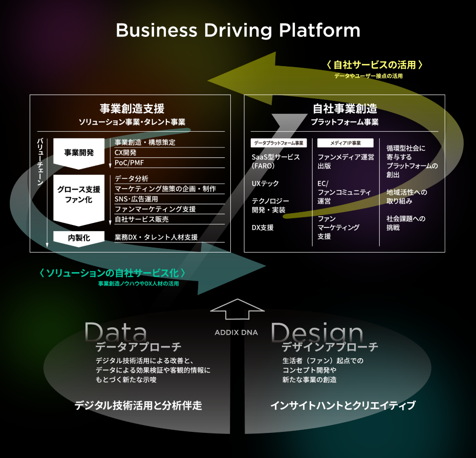 ADDIXは「課題解決から課題創造へ。そして未来創造へ。」をビジョンに、データとデザインの力で、事業創造と実装支援を加速させ、企業と人、社会に持続的な成長をもたらすビジネスドライブプラットフォーマーです。