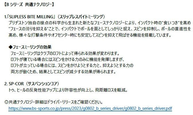 当シリーズは、様々な打撃条件やオフセンターヒット時にも安定してスピンを抑え、インパクトのパワーを逃さず伝えるブリヂストン独自の接点の科学から生まれた新たなフェーステクノロジー「スリップレスバイトミーリング」を搭載。ボールの滑りを抑える食いつくフェースにより直進性の高い飛びを追求しています。また、フェースの反発性能を高める独自技術である SP-COR(サスペンションコア)も搭載しております。