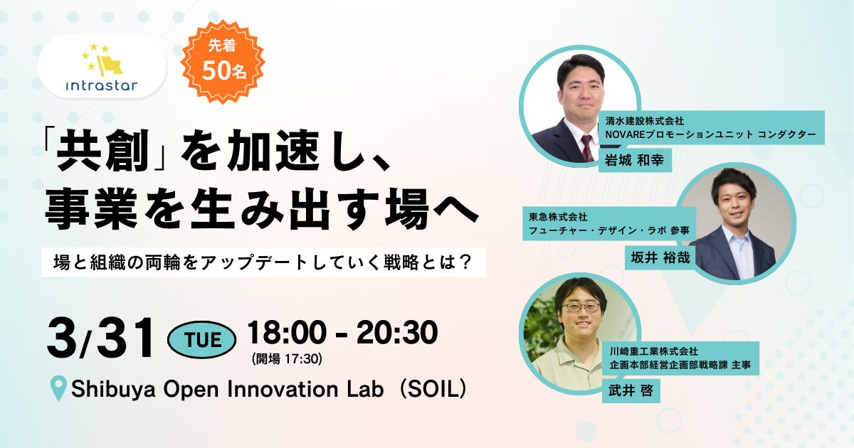 「社内起業家(イントラプレナー)をスターにする」ことをパーパスに掲げる共創コミュニティ「Intrastar(イントラスター)」は、「「共創」を加速し、事業を生み出す場へ:場と組織の両輪をアップデートしていく戦略とは?」を2026年3月31日(火)に開催いたします。