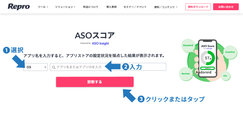 無料診断を行う手順は、「ASOスコア」のWebページ(https://repro.io/aso-score/)にアクセスし、(1):iOSまたはAndroidいずれかのOSを選択後、(2):アプリ名またはアプリIDを入力、(3):「診断する」をクリックまたはタップするだけ。すると、すぐに入力したアプリのASO対策状況に関する評価点や改善余地などを確認することができます。