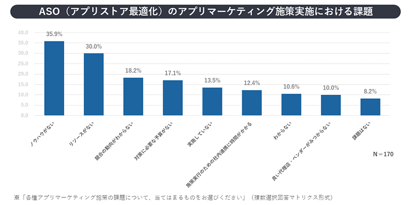 実際、当社が実施した「アプリマーケティング実態調査2022年度版」※では、「アプリマーケティング施策実施における課題」に関する設問で、ASOに関して「ノウハウがない」との回答が35.9%と最も高い割合を占めることが判明しています。