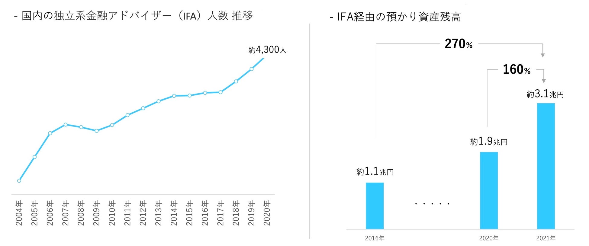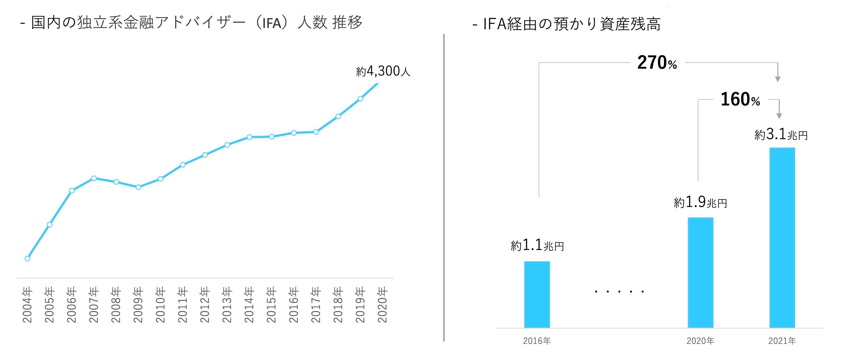 一方で国内のIFA人数は約4,300人※1 と、米国と比較すると約32倍(2020年時点)の差があり、まだまだ浸透していないのが現状です。しかし、IFA経由の預かり資産残高※2 は2016年に約1.1兆円、2021年には約3.1兆円と270%伸びており、今後、国内でも多くの金融機関所属アドバイザーがIFAにシフトし、市場の成長速度は加速していくと考えられます。
