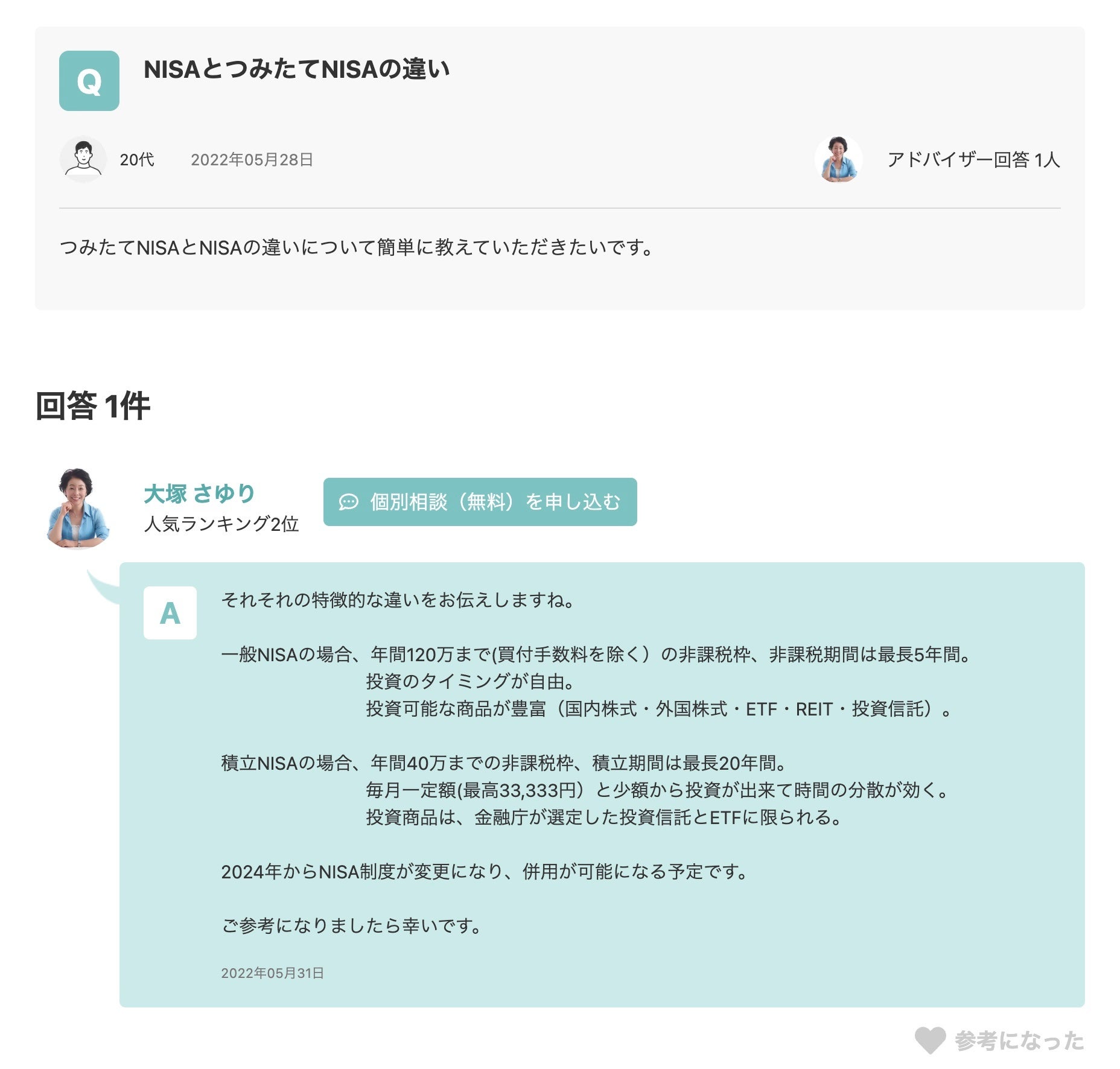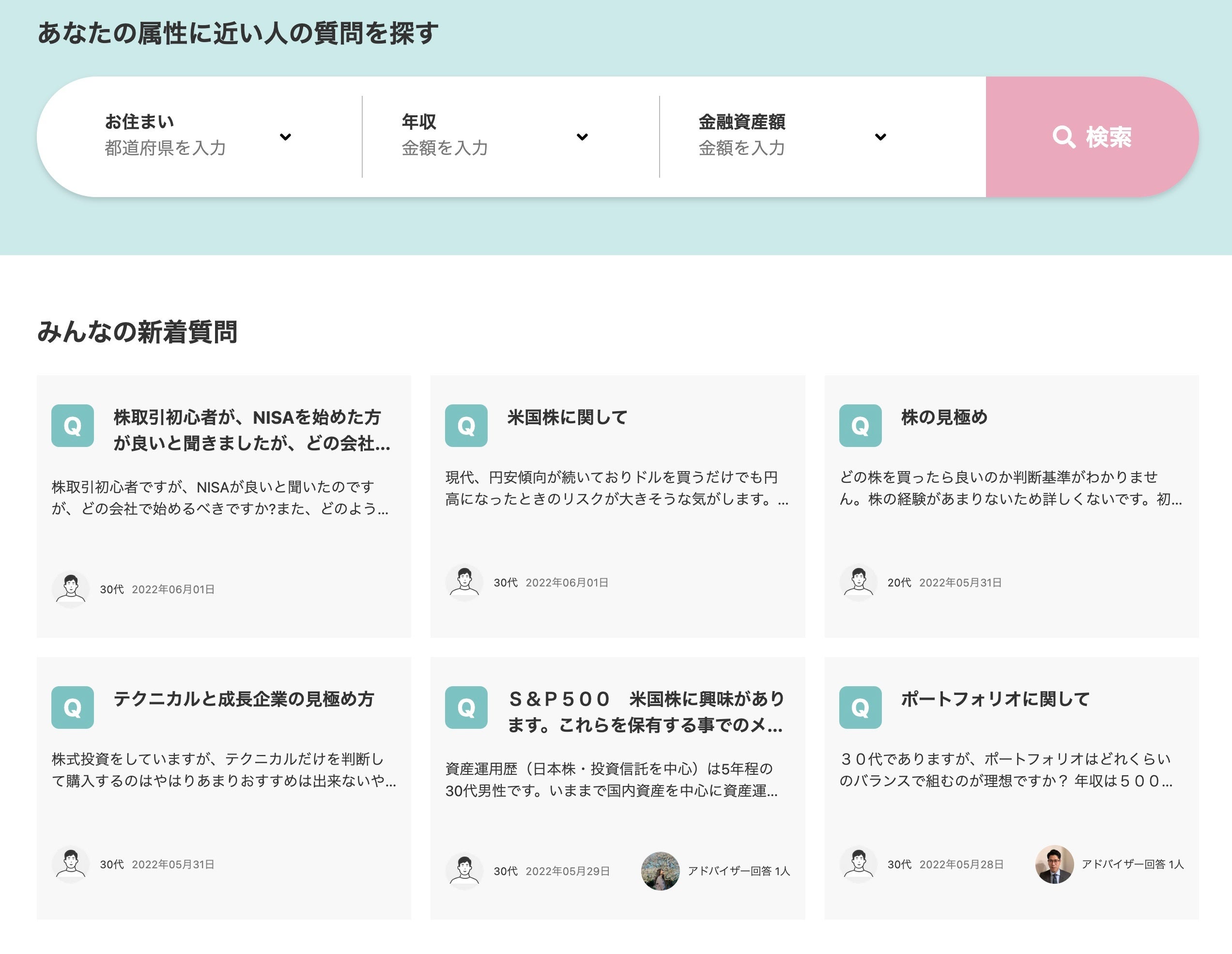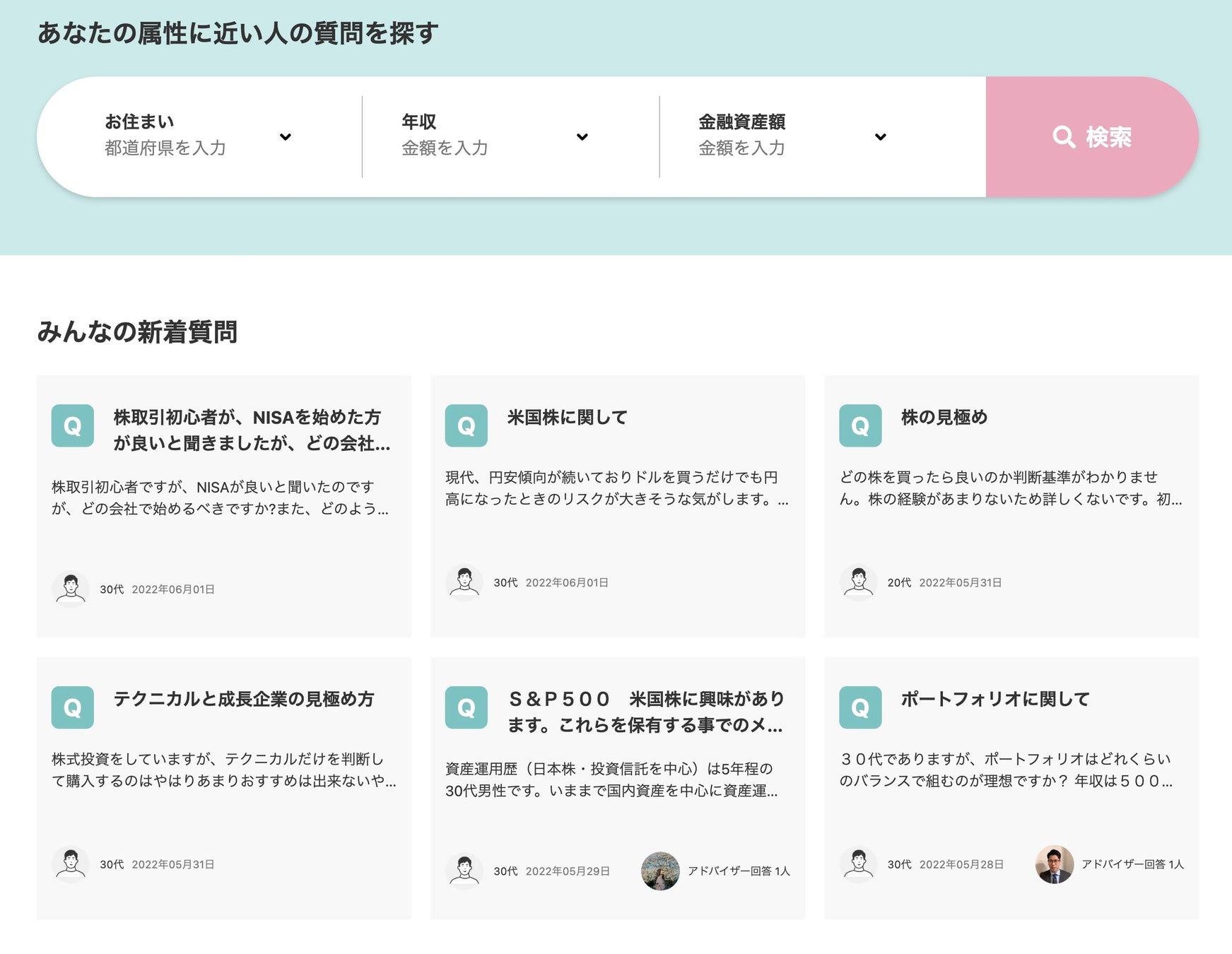 ユーザー(一般投資家)が資産運用に関する質問をIFA(独立系ファイナンシャルアドバイザー)に無料で行える資産投資相談プラットフォームです。