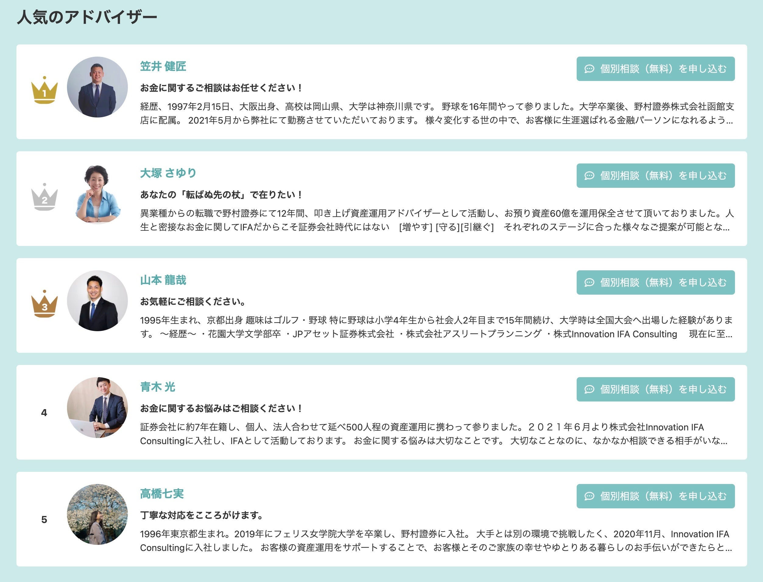 既に、株式会社アイ・パートナーズフィナンシャル、株式会社バリューアドバイザーズ、株式会社Fan、株式会社innovation IFA Consultingをはじめとした「IFA企業」に所属する多くのIFAに参画いただいており、「みんなの資産運用」ではユーザー(一般投資家)が抱える資産運用の質問をIFAに無料で行えることで、その人に合った最適なプラン、アドバイザーをマッチングし、「個人投資家」と「証券会社」、及び「IFA」の三方良しを実現。オンラインで結び付けるDX化の促進をしてまいります。