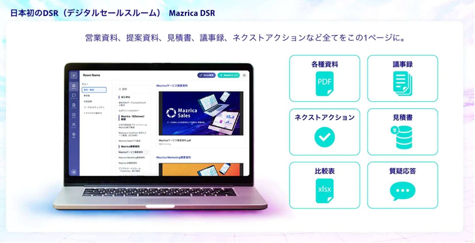 国内初のデジタルセールスルーム「Mazrica DSR」は、商談にまつわる情報を1つのページに集約し、営業と顧客がそれぞれが情報共有に活用できるセールステックです。これにより、営業活動の効率化・高度化・標準化を通じた受注率向上や、顧客の購買体験の向上が期待されます。