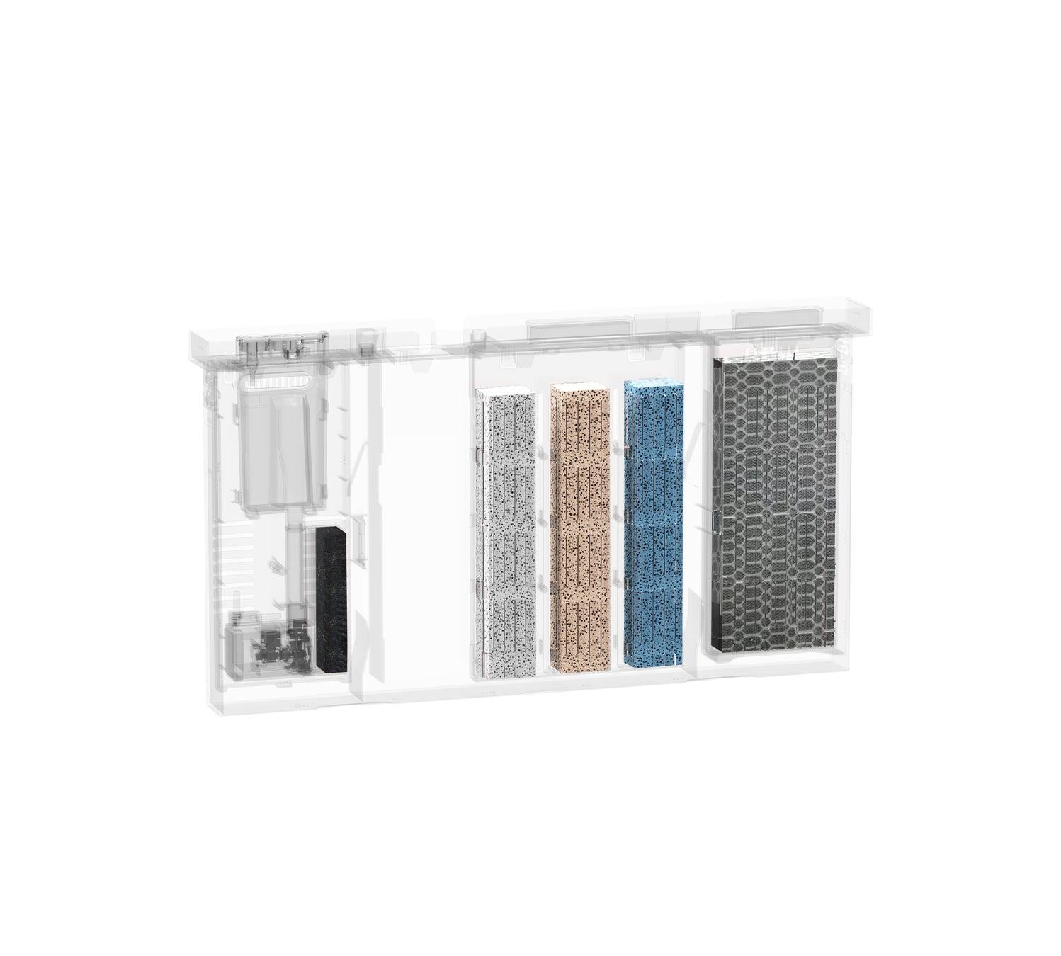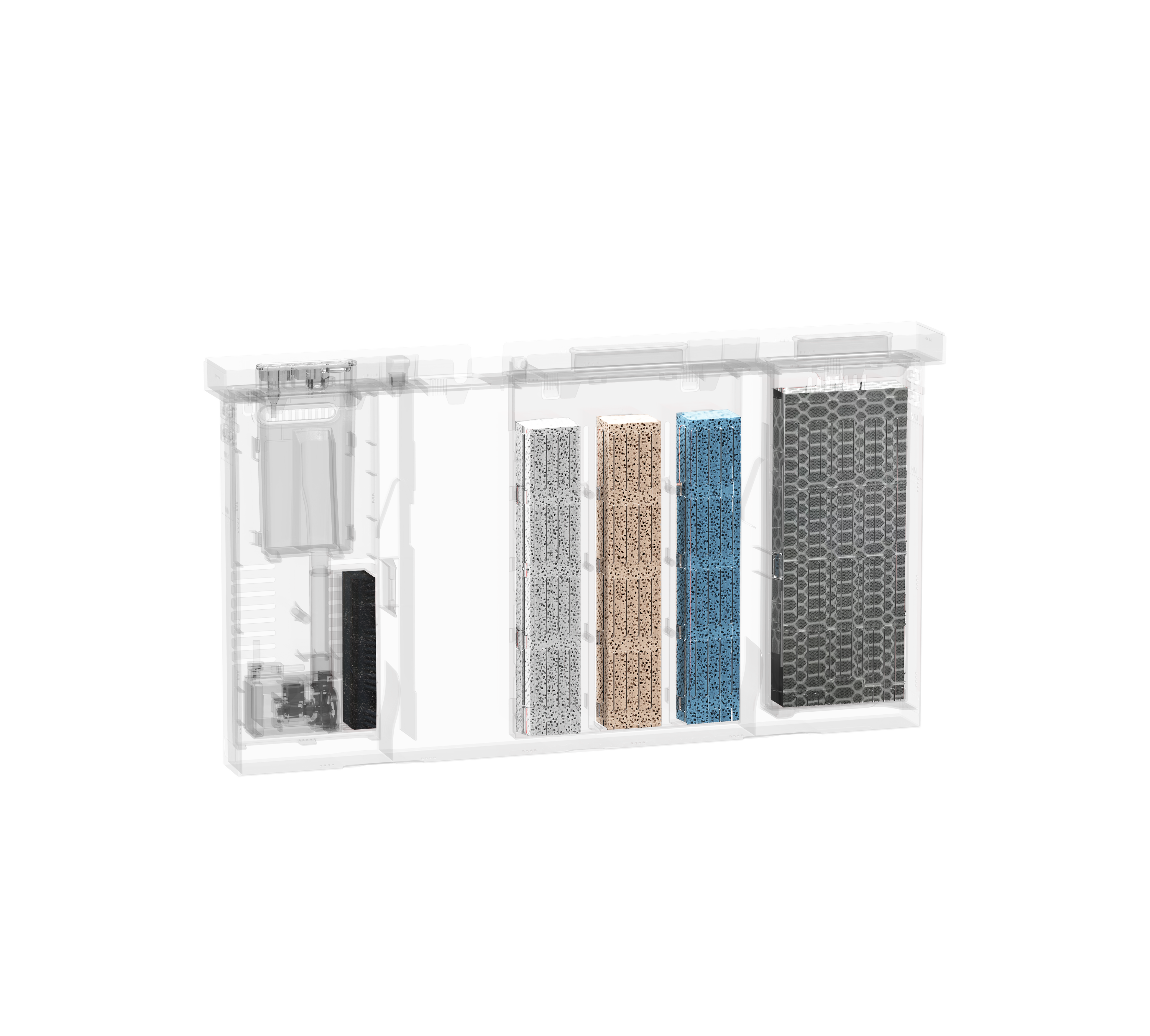 ●バイオフィルター:3種のバイオフィルター(ナノサイズのトルマリンパウダーを配合/海洋バイオテクノロジーの高分子電解質材料のキトサンを配合/活性メタケイ酸型火山泥とマイクロ木魚石を配合)がセットされています。この3種のフィルターに含有している成分が川の水質を再現するための成分になっており、ポンプの作動で水がバイオフィルターを通ることにより、水質がより川の水質に近い状態になります。これにより、お魚が生育しやすい環境を作り出し、お魚がより長生きできるようになります。