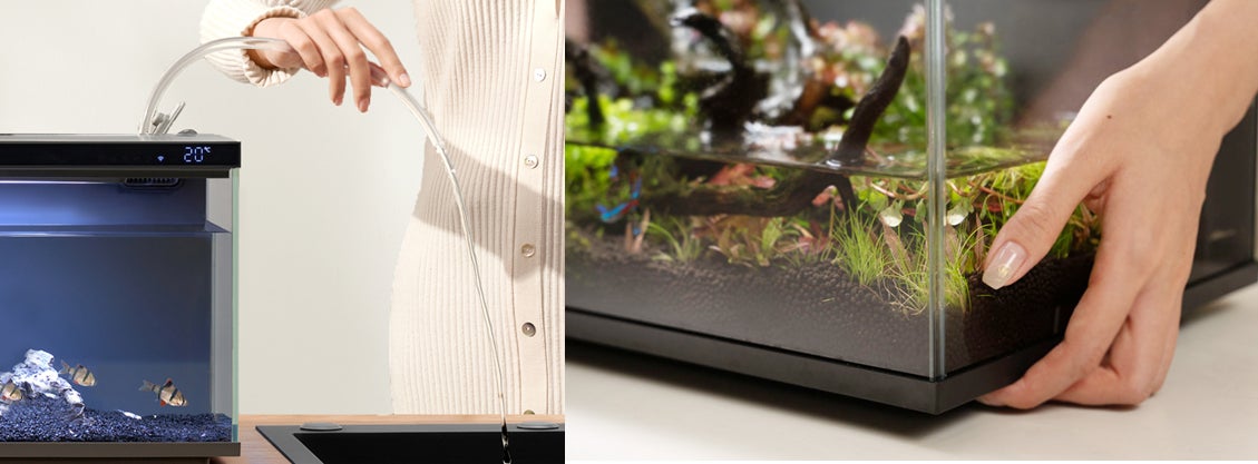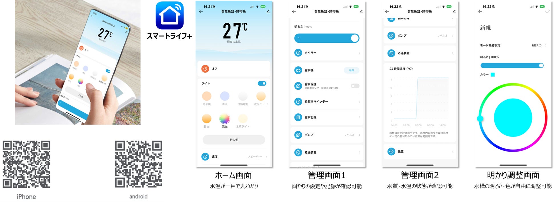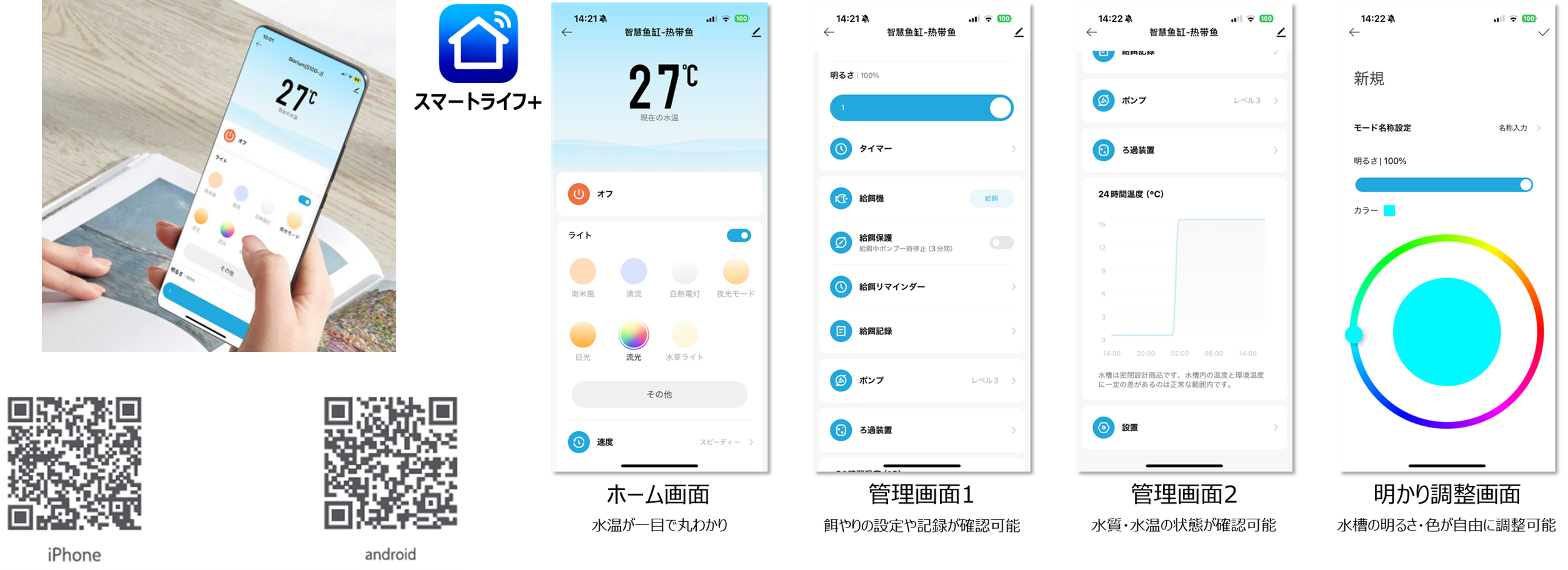専用アプリ「スマートライフ+」をダウンロードしていただければ、水温や照明、餌やりや水流まで調整・管理が可能です。遠隔操作が可能なため、ちょっとした外出時や、長期のご旅行の際でも、安心してお魚との暮らしを楽しんでいただけます。