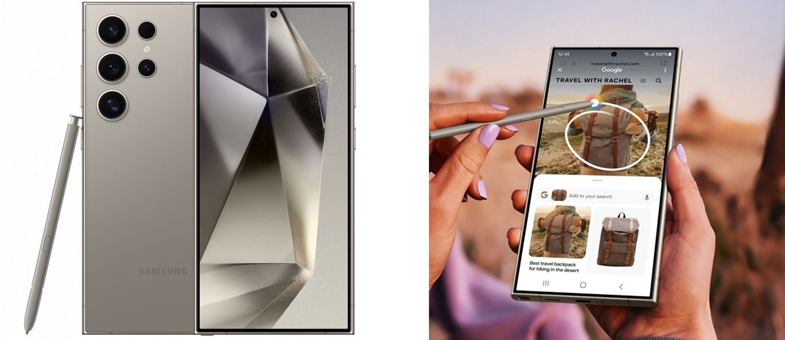「Galaxy S24 Ultra」とSペン (左写真)、 かこって検索(Circle to Search) (Sペン使用時:右写真)