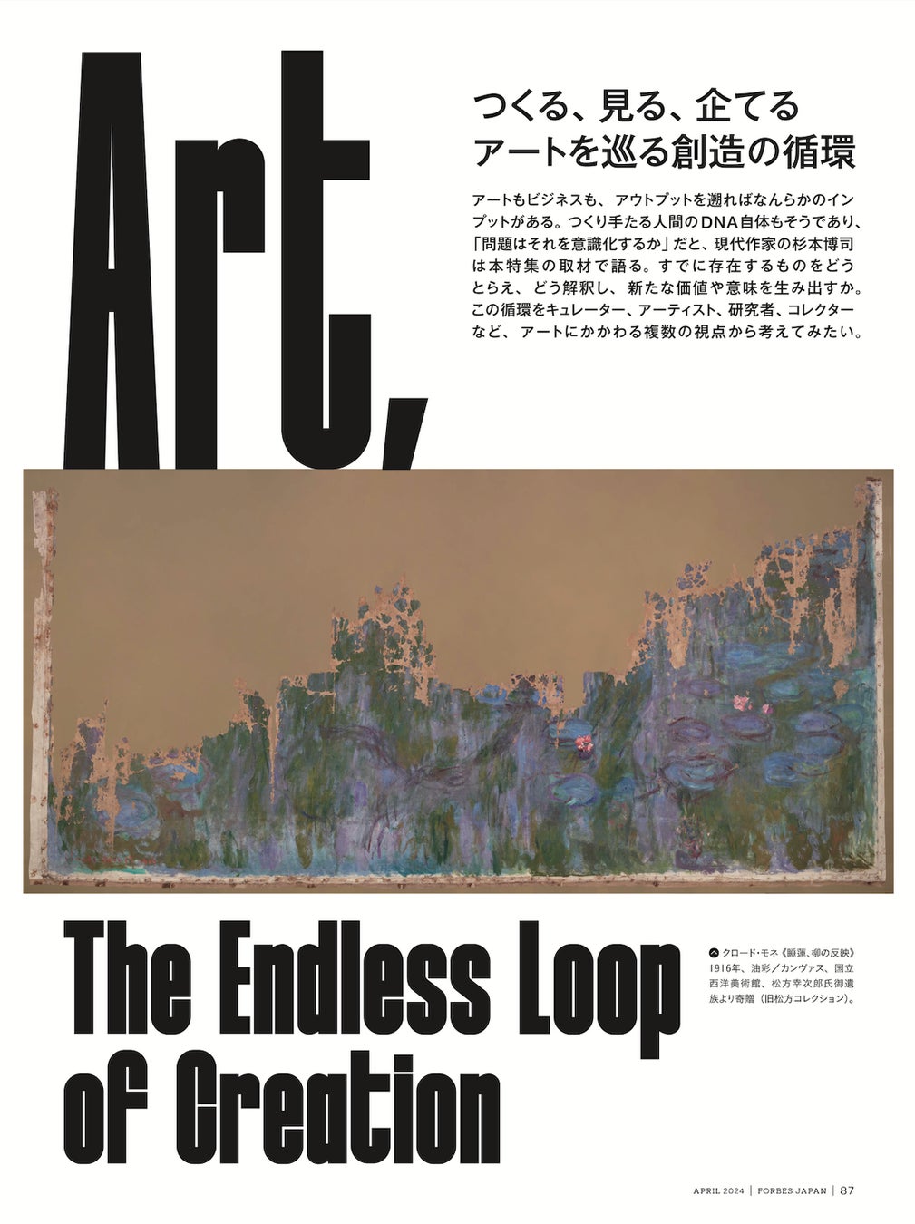 アートもビジネスも、何らかのインプットがあって、アウトプットという成果物があります。坂本龍一が東京藝大の学生時代にどんな授業に影響を受けたのか、創造の源泉をアーカイブ化するプロジェクト、現代美術家杉本博司の「本歌取り」にまつわるインタビュー、アートコレクターとして知られる大林組会長など、超一流の創造についての特集です。