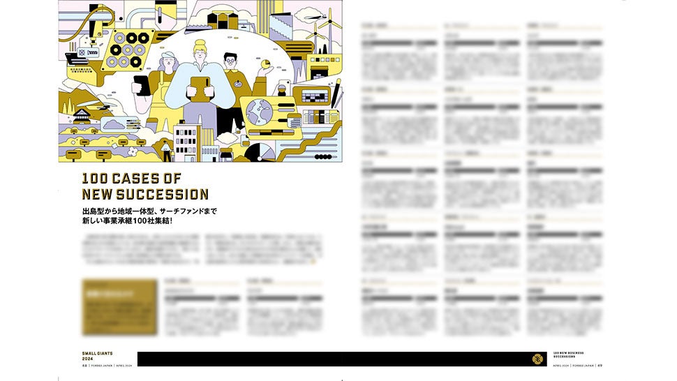 Forbes JAPAN4月号は、4大特集! ニッポンが誇る小さな大企業「スモール・ジャイアンツ」は、規模は小さくても偉大な価値をもつ企業を47都道府県から発掘。世界を舞台に独自の道を切り開く「新しい中小企業」を総力取材した。そして社会課題となっている中小企業の「事業承継」にフォーカス。多様化する事業承継の100の事例を集め、これからの「新・事業承継100」としてカタログ化。今起きている変革を追った。そのほか、米フォーブスが選ぶ「30 UNDER 30 2024」や、アートがもたらす発想のプロセスを探った「アートを巡る創造の循環」など、盛りだくさんの内容でお届けする。