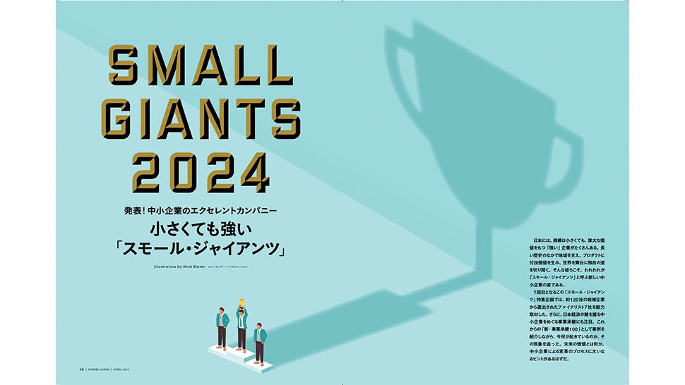 すごい会社は、大きい会社とは限りません。世界が共鳴するビジネスは日本の各地にたくさんあります。そんな企業を発掘して表彰するのが、年に一度のスモール・ジャイアンツ特集です。組織は小さくても価値は「ジャイアンツ」。47都道府県からファイナリストに選ばれたのは、神奈川県、京都府、愛知県、宮城県、沖縄県、和歌山県、埼玉県の企業。地域が誇る企業の珠玉のストーリーを紹介します。