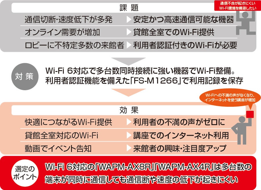 通信切断や速度低下のない環境を整えるためにWi-Fi環境を強化。Wi-Fi 6(11ax)対応機器で貸館利用者と来館者向けの2つのWi-Fiを提供