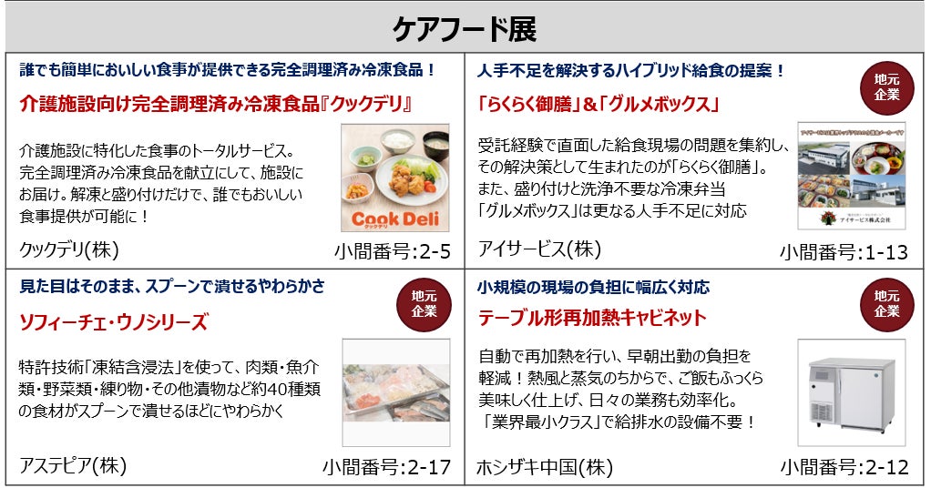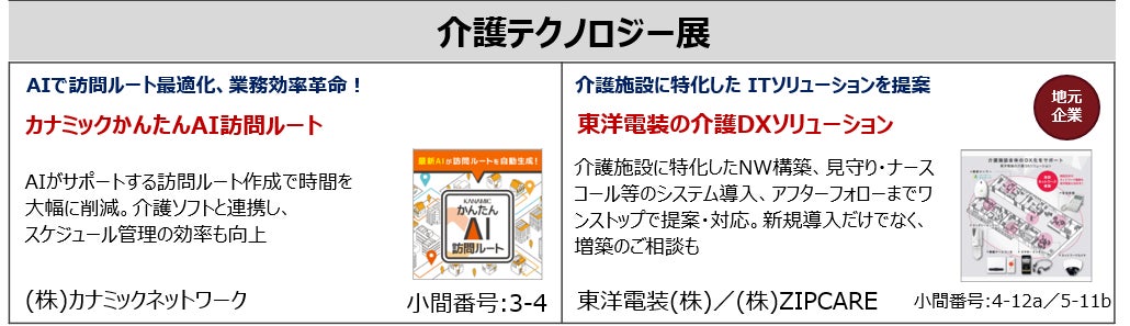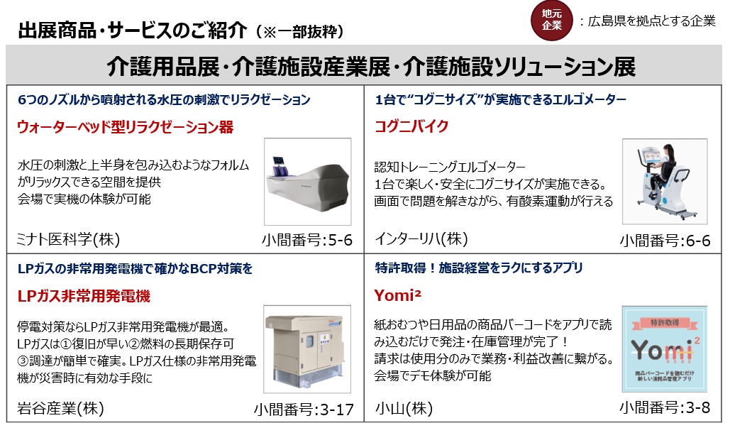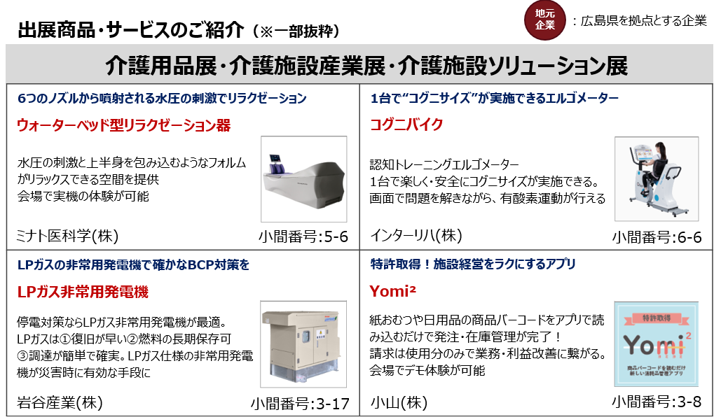 本展には、介護分野の主要企業約75社が出展。最新の介護用品やリハビリ機器、介護ロボットやシステムのほか、配食・給食サービスや厨房機器など様々な商品・サービスが集結。介護事業者が商品選定や商談を目的に来場する。