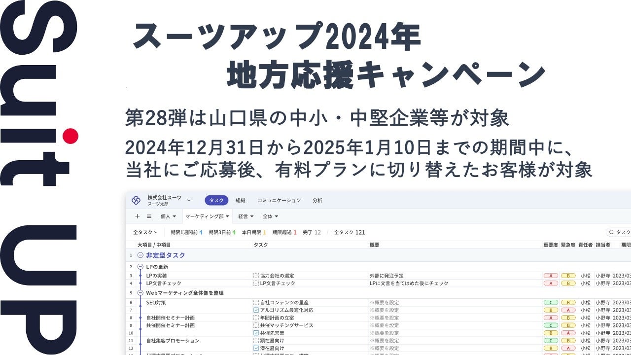 株式会社スーツ(所在地:東京都千代田区、代表取締役社長CEO:小松 裕介)は、「スーツアップ2024年地方応援キャンペーン」第28弾として、山口県の社員数100名未満の中小・中堅企業、スタートアップを対象に割引キャンペーンを実施いたします。