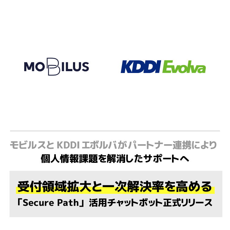 モビルスとKDDIエボルバがパートナー連携により個人情報課題を解消したサポートへ ~受付領域拡大と一次解決率を高める「Secure Path」活用チャットサポートを正式リリース