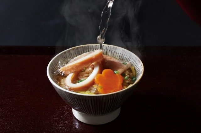 3) 薬味と一緒に、ポットでお届けする「おだし」をかけてお茶漬けでお召し上がりください。