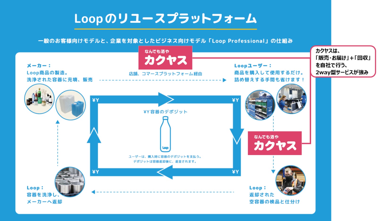 カクヤスは自社によるお届けだけでなく回収も強みにした2way型サービスを特長としており、販売したビール瓶や樽詰商品等のリターナブル容器の回収を行っております。このカクヤスのサービスを活かし、今回Loopのリユース容器商品の取り扱いを拡大することで事業を通じた環境課題への取り組みを推進してまいります。