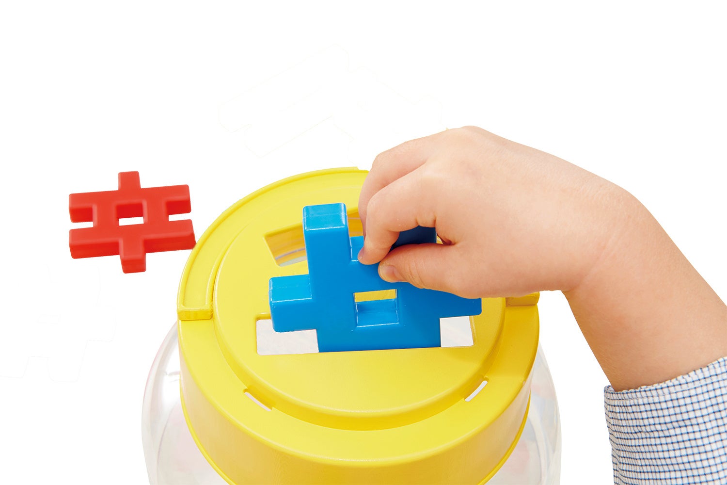 子どもが大好きな「型はめ遊び」ができるボトルのセット。フタ部分に空いている3種の大きさの穴にパーツを落とすことで形や大きさの認識力を養うことができます。また、指先を使う「つなげる遊び」や想像力を引き出す「見立て遊び」など多様な遊びが楽しめます。