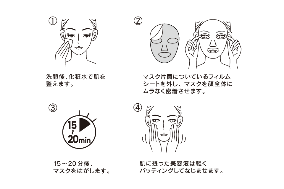 純度99%のビタミンC*¹とコラーゲン*³を配合した美容液を含んだシートマスクで、毛穴*²のスペシャルケアができます。たっぷりの美容液で毛穴*²をふっくらと保湿することにより、引き締まったハリ感のある美肌へ導きます。さらに、クリアな肌印象に導く成分も配合しました。15~20分パックすることで、肌に美容成分とうるおいが十分に浸透*⁴し、うるおいに満ちた、透明感*⁵のある肌印象へ導きます。