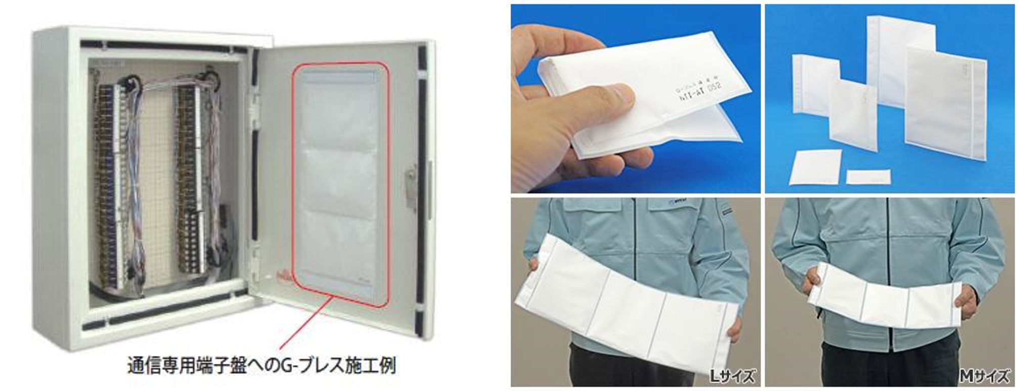屋外電気機器の故障は高湿度や結露による要因が多く、従来シリカゲルなど除湿剤で対策していましたが、一定量の水分を吸収すると性能が急激に低下してしまい取り換えやそれに伴う作業が発生していました。G-ブレスは湿度が高くなると吸湿し結露の発生を抑制し、低湿時には放湿することで長期使用が可能です。また、電力不要で薄く軽く曲げることもできるため、既存設備にも設置可能で、トラブルを未然に防ぎます。