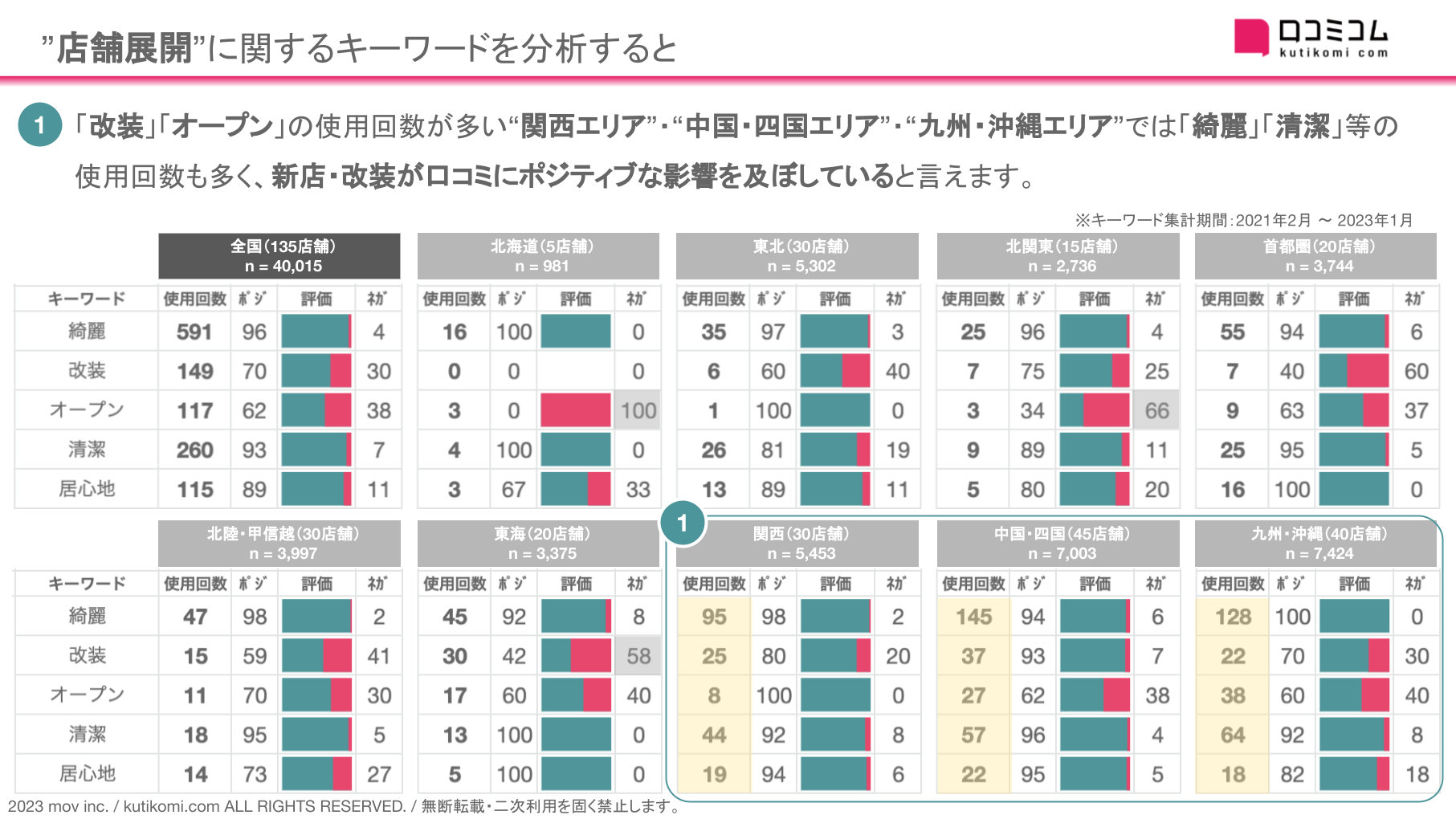 」等の使用回数も多く、新店・改装が口コミにポジティブな影響を及ぼしている