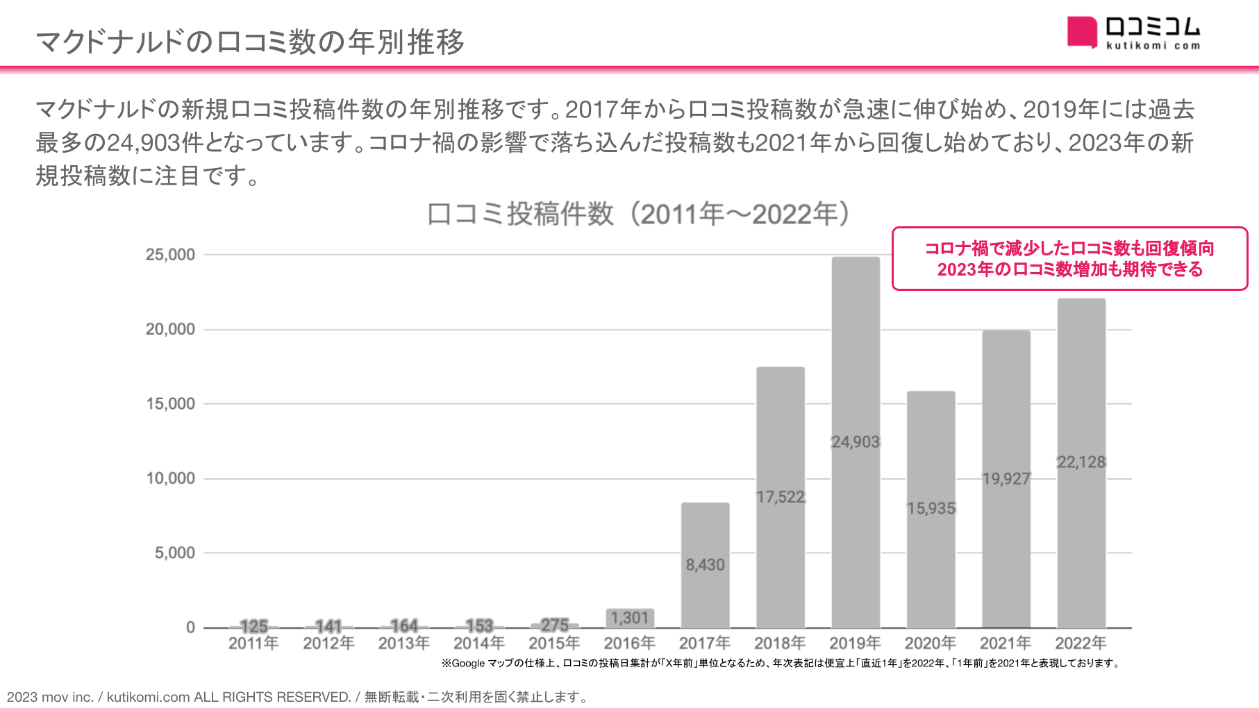 今回は、マクドナルド235店舗に寄せられた約2.3万件の口コミを分析し、口コミ数の推移やエリアごとの比較検証を行いました。
