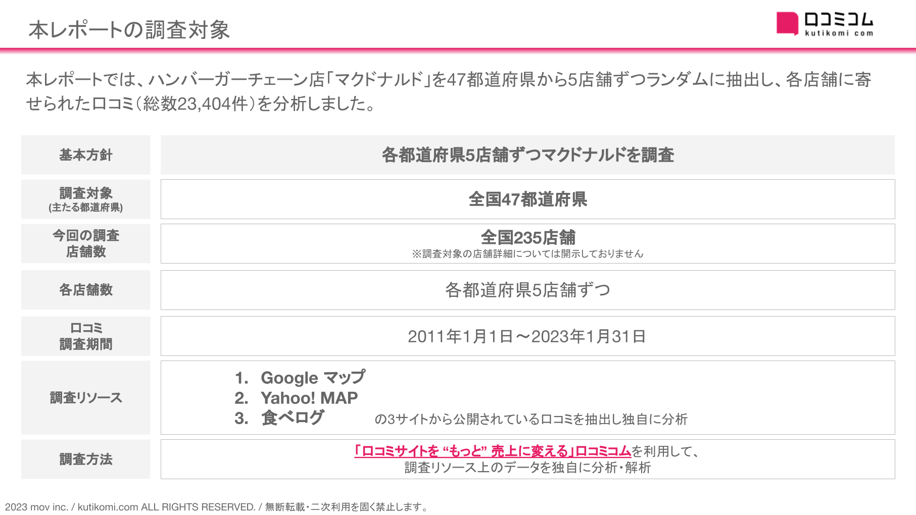 本レポートでは、ハンバーガーチェーン店「マクドナルド」を47都道府県から5店舗ずつランダムに抽出し、各店舗に寄せられた口コミ(総数23,404件)を分析しました。