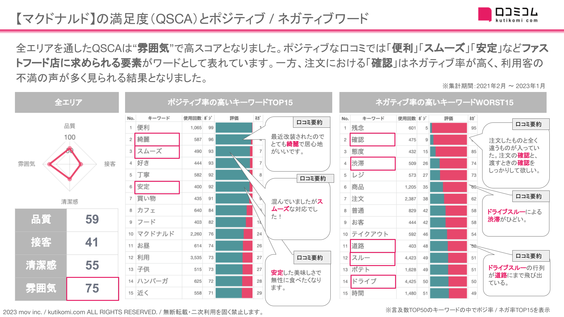 それらのAI解析を用いた分析例として「マクドナルド」のQSCA・頻出ポジネガキーワードを確認しました。