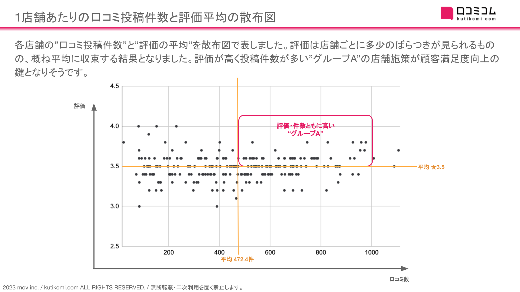 各店舗の”口コミ投稿件数”と”評価の平均”を散布図で表しました。評価は店舗ごとに多少のばらつきが見られるものの、概ね平均に収束する結果となりました。評価が高く投稿件数が多い”グループA”の店舗施策が顧客満足度向上の鍵となりそうです。