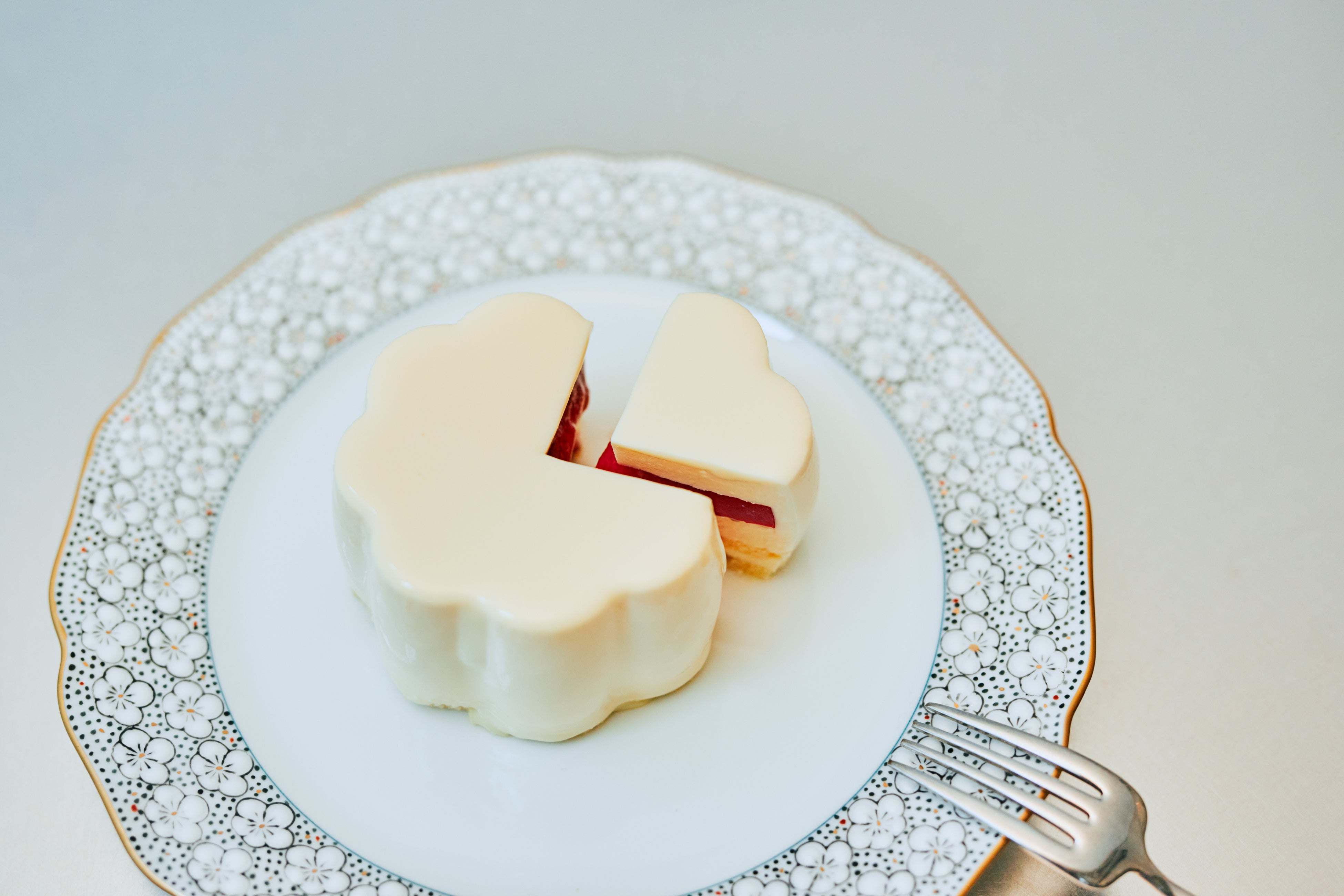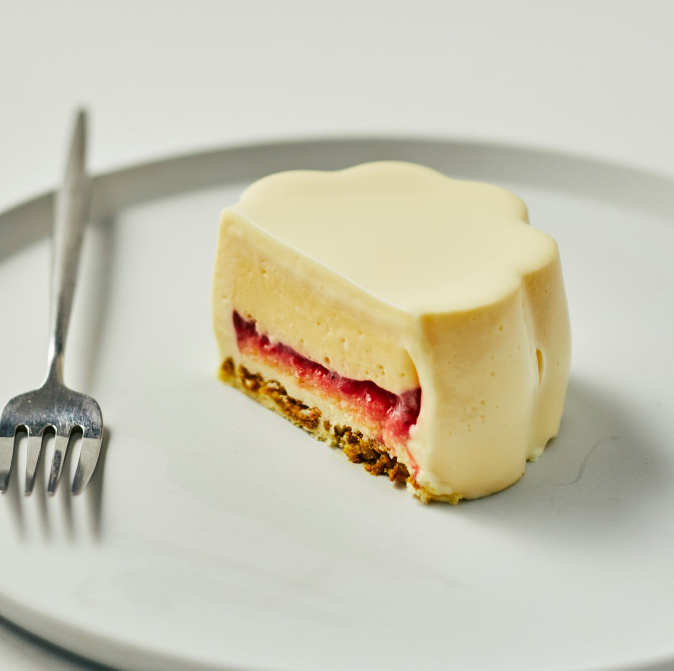 華やかで清らかなホワイトチョコレートムースに、エルダーフラワーの香りを織り交ぜました。中には、旅するメゾンで出会ったあまおう苺とフランボワーズの甘酸っぱいジュレ、そしてフルーティーなオレンジハチミツムースが重なり合います。 軽やかなスポンジに、ローストピスタチオのクランチがアクセントとなり、爽やかさと深みが共存する味わいを実現しました。