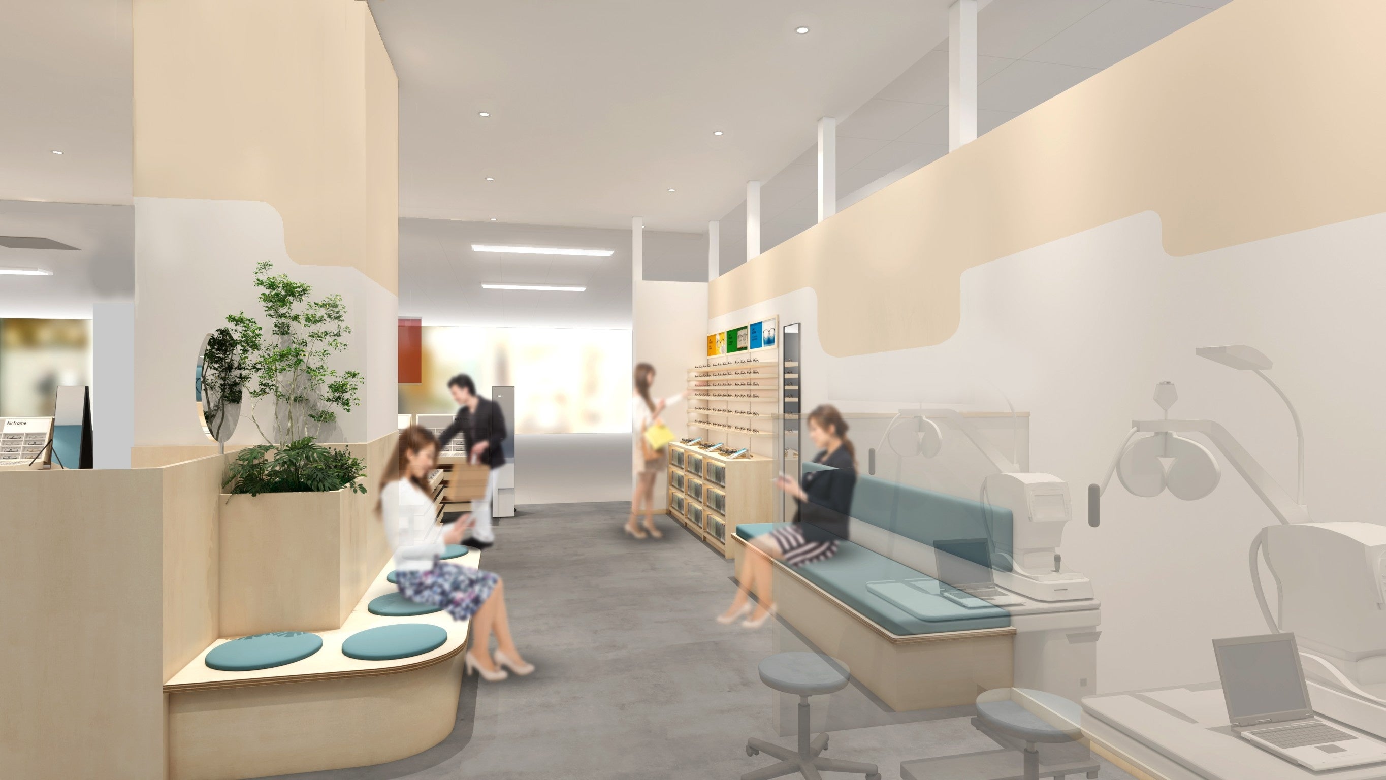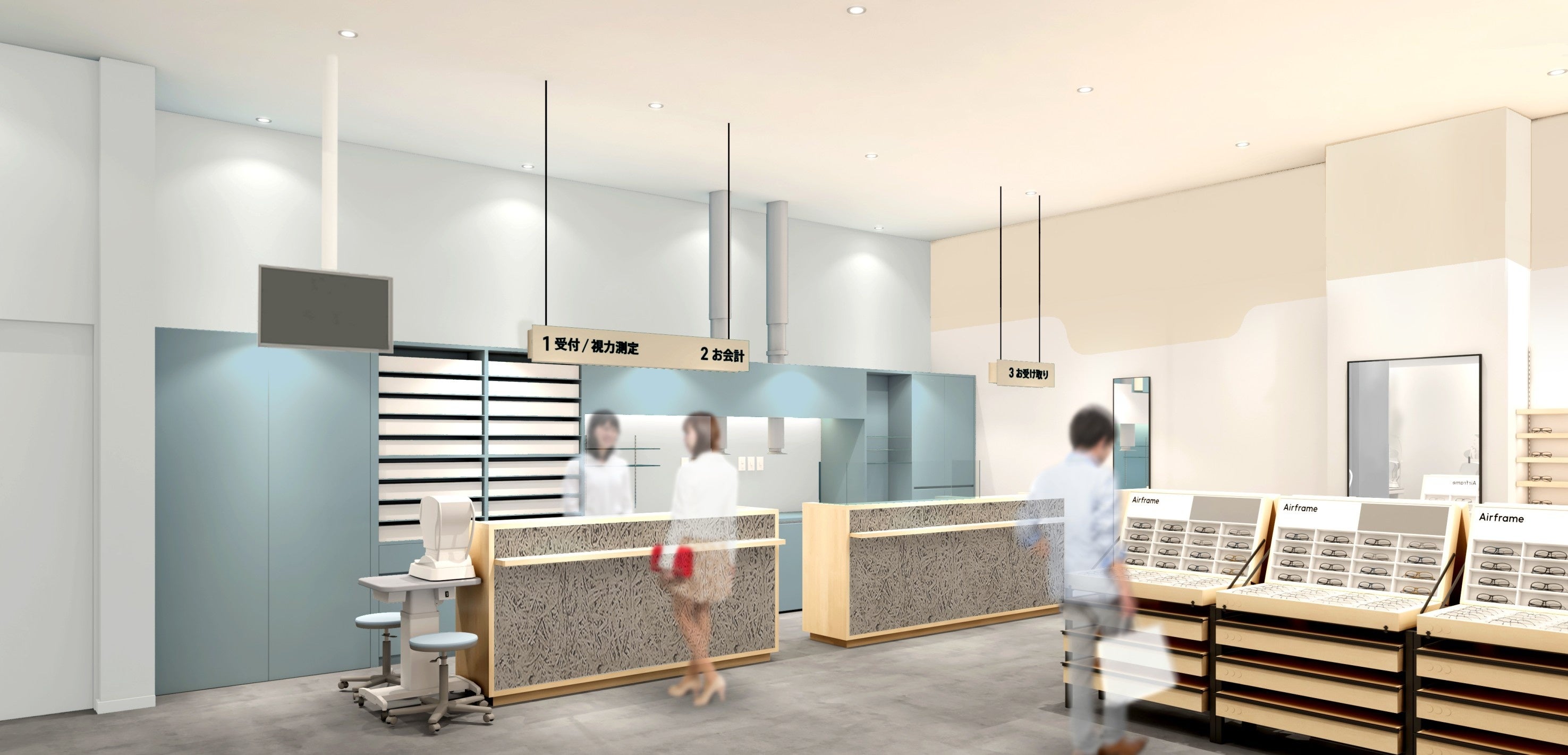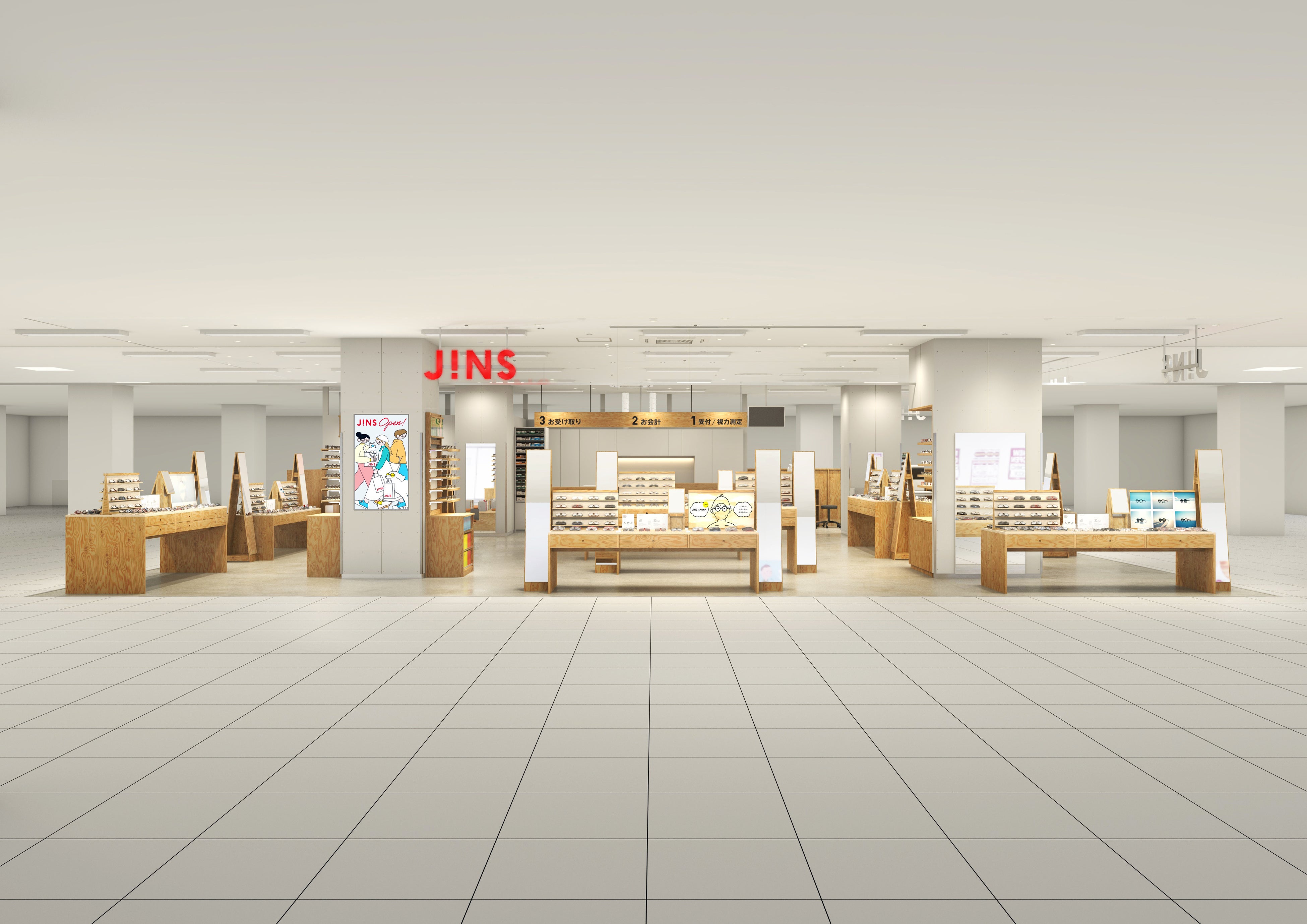 今回出店するのは「イオン北見」「イオン釧路」で、それぞれ北見市内、釧路地区内で最大級の商業施設です。道東エリアで南北に位置する2施設に相次いで出店することで、より多くのお客様にご利用いただけるようになります。また、施設を訪れる幅広い年代のお客様のニーズに応えられるよう、キッズからシニアまで多様なラインアップをご用意し、高品質のアイウエアをリーズナブルな価格でご提供します。「JINSイオン北見店」は、“北見の自然”を取り入れ、空や海が映った流氷をイメージした青色をアクセントに、壁面には北見を囲む山々を抽象的に表現した、名産の玉ねぎ色のグラフィックが店内を彩ります。「JINSイオン釧路店」は、シンプルさを追求した商品棚を採用し、あえて高さを様々に変化させることで空間に遊びと抑揚を取り入れました。両店舗とも、地域のお客様が親しみを持ち、メガネ選びをお楽しみいただける空間をご提供します。