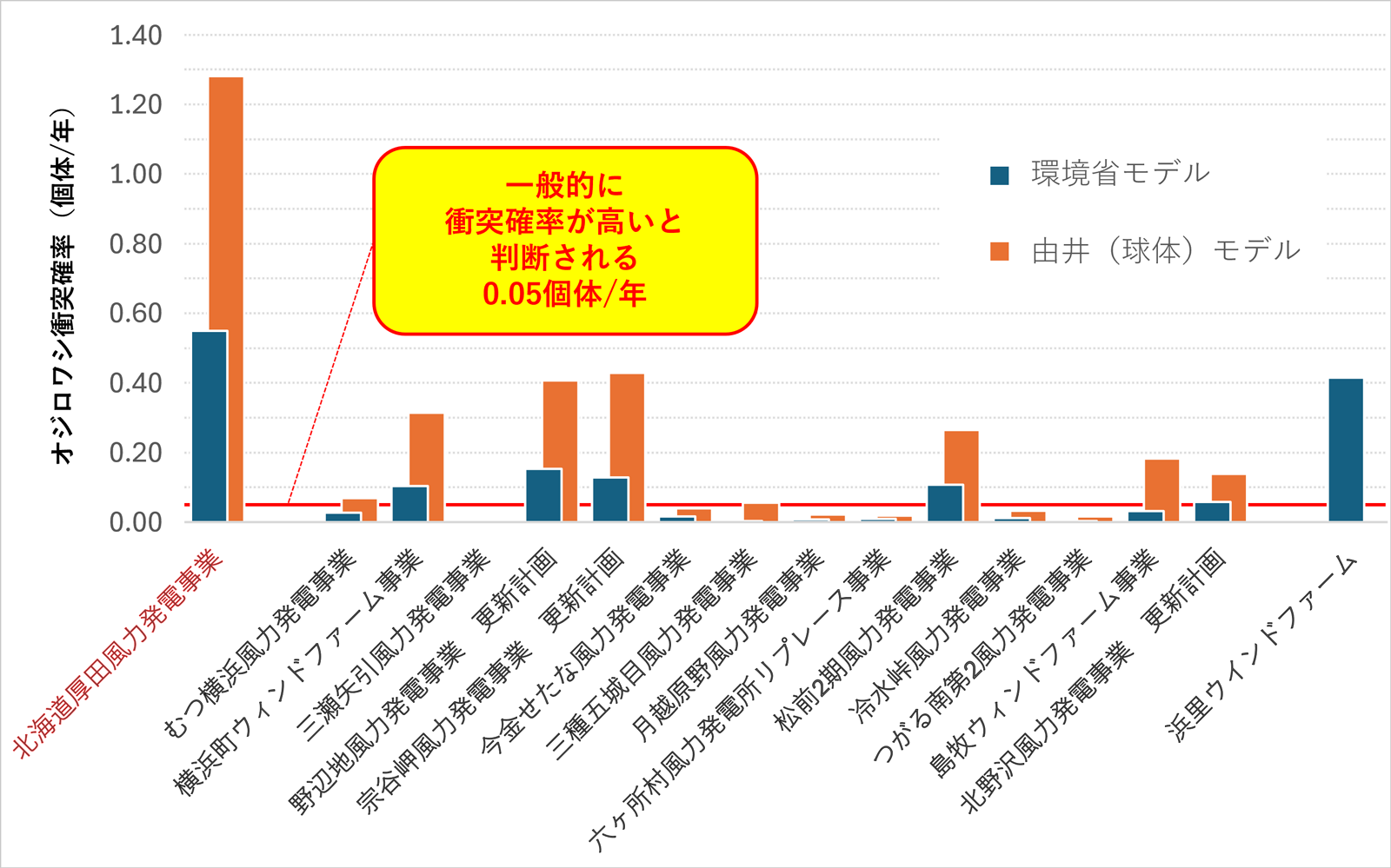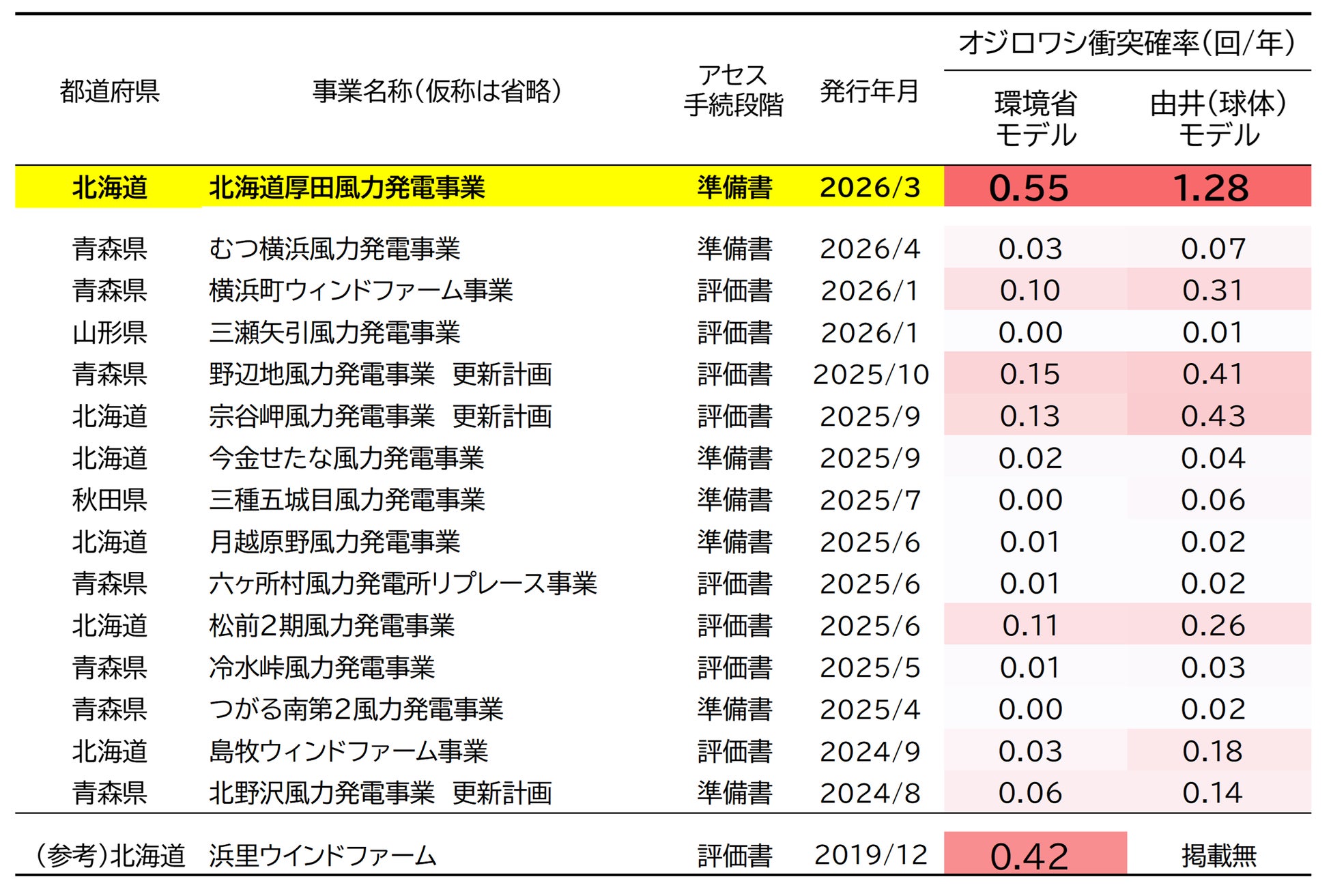 2024年度以降に環境アセス図書(準備書・評価書)を提出した15事業(本事業を含む)と2019年に評価書を提出した浜里ウインドファーム(環境省モデルのみ掲載)における比較。なお、浜里ウインドファームはオジロワシの大量バードストライクの発生を受け、2026年1月以降現在も日中稼働を中止している(2026年4月時点)。他事業と比べても本事業の衝突確率が著しく高いことがわかる。