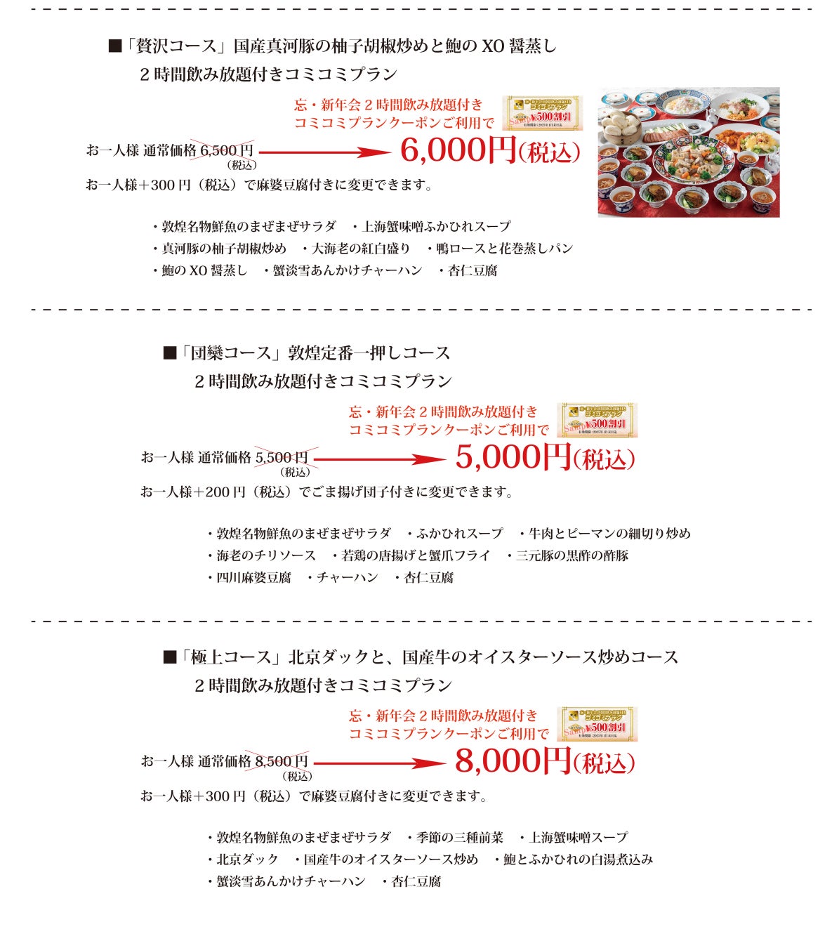 今年は創業50周年。四川料理をベースに、地元の皆様の中国料理店として伝統とトレンドが調和する料理を提供してきました「敦煌」。忘年会・新年会を迎える宴会シーズンにお得なプランを3選ご用意いたしました。どのプランも「2時間飲み放題付き」でございます。そして今回は「忘・新年会2時間飲み放題付きコミコミプランクーポン」をご利用いただきますと500円引き×ご人数分のサービスをさせていただきます。クーポンは店頭と企業ポスティングサービスで配布いたします。また、お一人様200円~300円プラスにて、追加料理オプションもございます。期間は11月1日(金)から翌年1月31日(金)まででございます。皆さまのご来店をスタッフ一同お待ちしております。この機会に是非、ご利用ください。