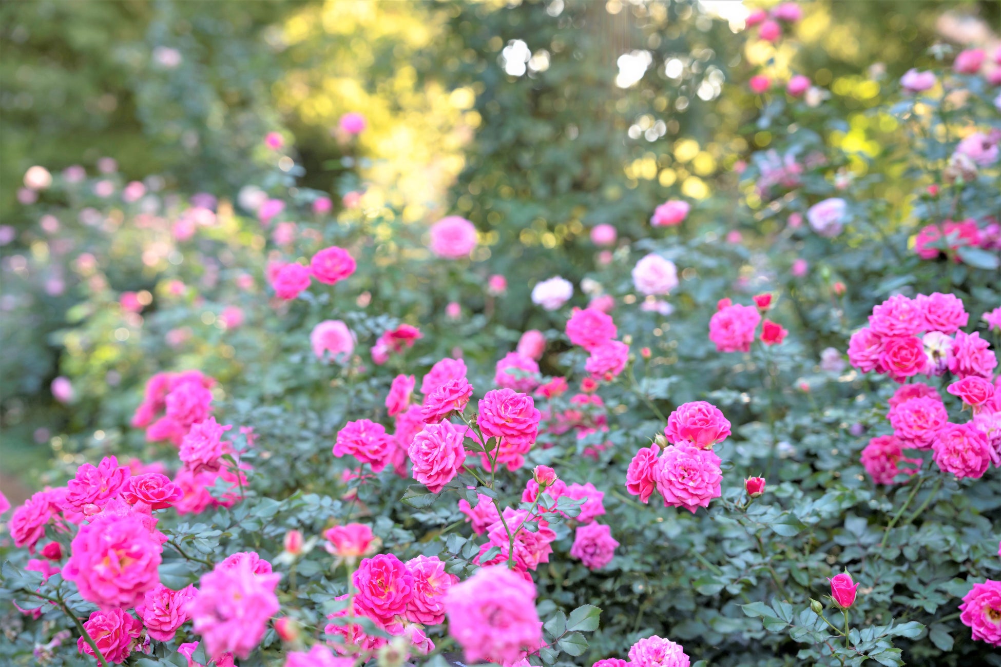 シンボルローズ「四季の香」をはじめ、園内の325品種のバラが秋の見頃を迎える
