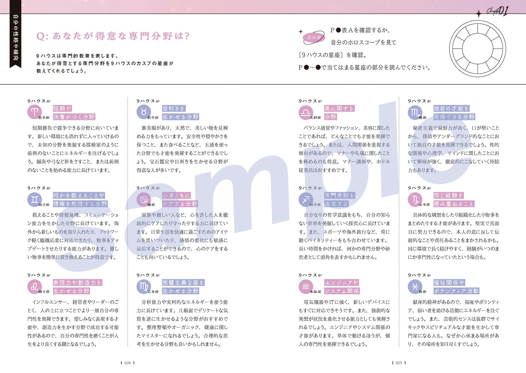 本書にはホロスコープの読み方のほか、自己をより深く知るための自己分析が78個載っており、自分のホロスコープを読み解きながら「本当の自分」「自分の強みや弱み」「課題」を知ることができます。自己を深く理解し、星の示す運命も味方につけながら、素敵な未来へと向かっていくことができる1冊となっています。