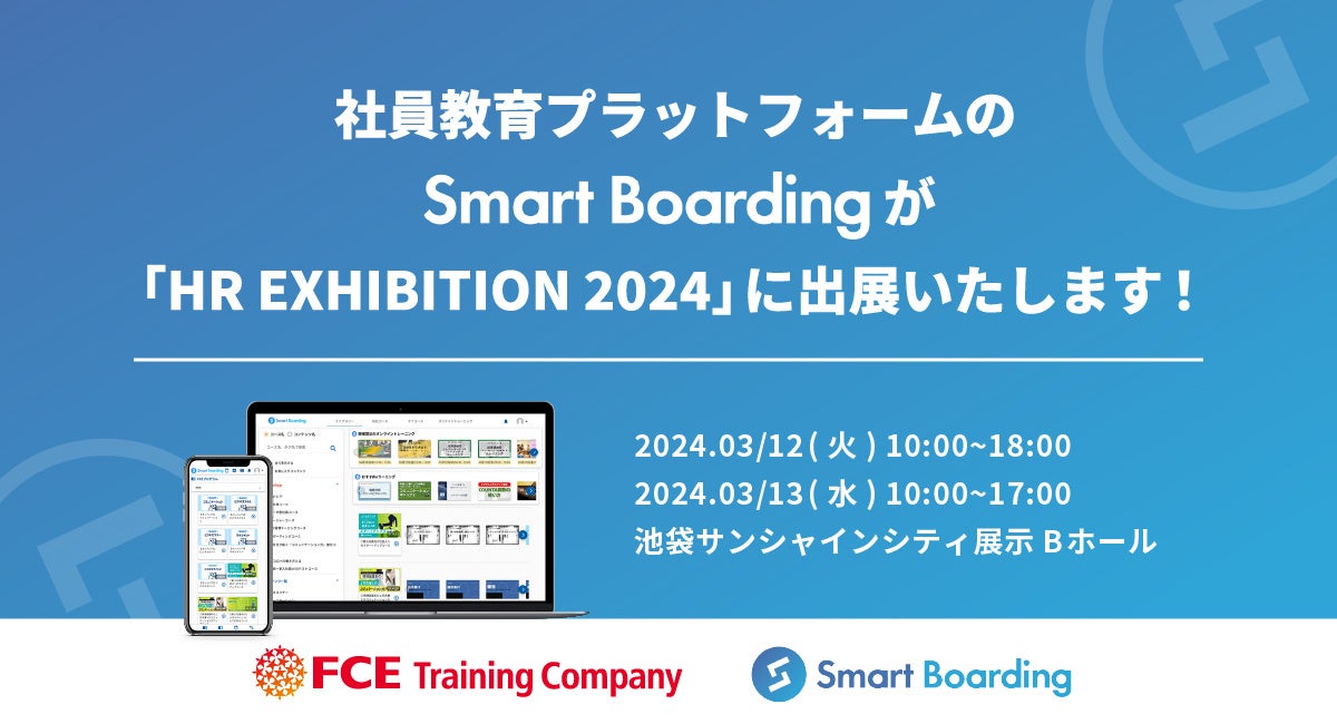 株式会社FCEトレーニング・カンパニー(本社:東京都新宿区、代表取締役社長:荻野純子が提供する、「Smart Boarding」(スマートボーディング)(https://www.smartboarding.net/)は、2024年3月12(火)・13日(水)の2日間、池袋サンシャインシティにて開催されます「 HR EXHIBITION 2024 Produced by Hajimari 」に出展いたします。