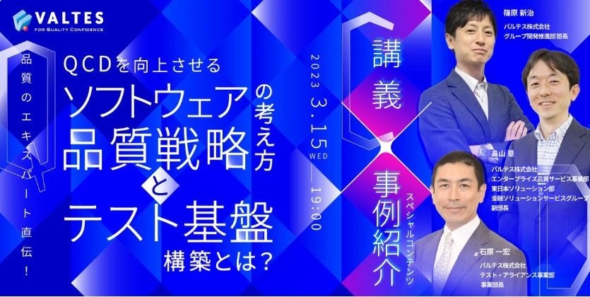 ソフトウェアのテスト・品質向上支援サービスを提供するバルテス株式会社(本社:大阪市西区、東京都千代田区、代表取締役社長:田中 真史)は、2023年3月15日(水)に無料Webセミナー「【品質のエキスパート直伝!】QCDを向上させるソフトウェア品質戦略の考え方と『テスト基盤』構築とは?~「講義」×「事例紹介」スペシャルコンテンツ~」を開催いたします。