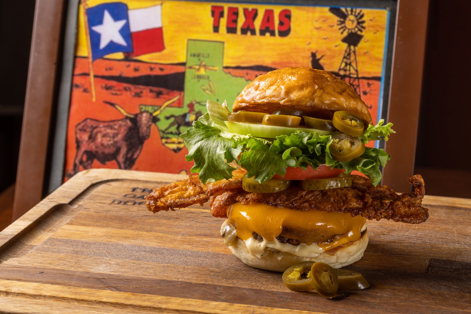 牧畜業に長い歴史を持つテキサス州。テキサスの空の玄関口である都市、フォートワースのシンボルである巨大な角を持つ牛「テキサスロングホーン」の特徴的な角に見立てたフライドベーコンが目を引くワイルドなバーガーです。バーベキューグリルで焼き上げた140gのプライムビーフパティに、レタス、トマト、オニオンリング、ピリッとしたアクセントを添えるハラペーニョ、そしてバターミルクのころもでカリッとジューシーに揚げたベーコンを挟んだ、食欲そそる、ボリューム感あふれる一品です。